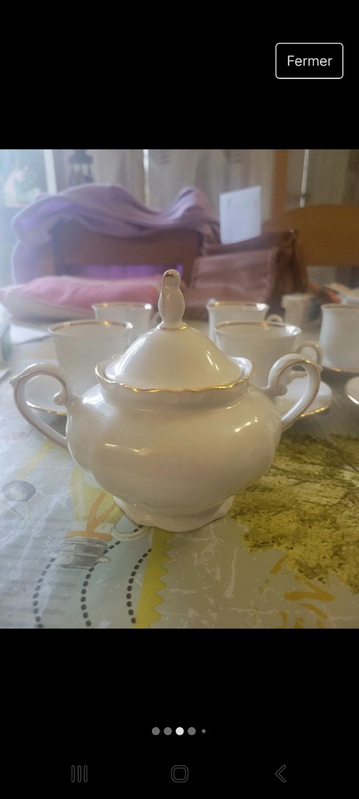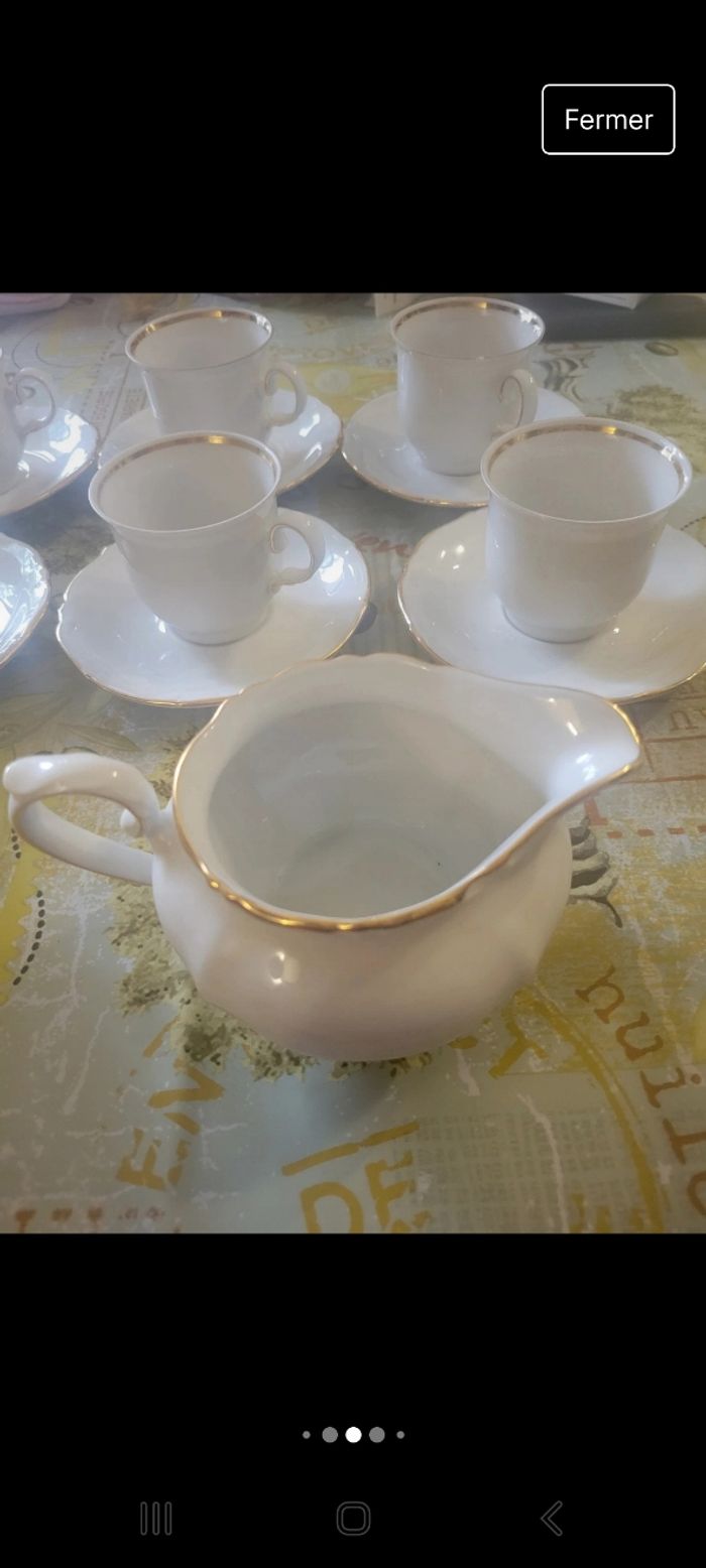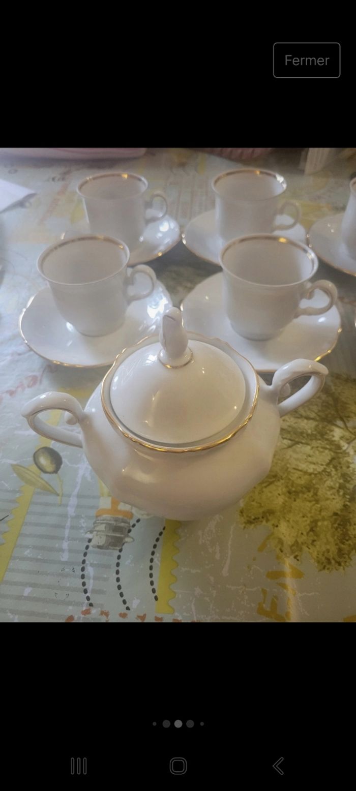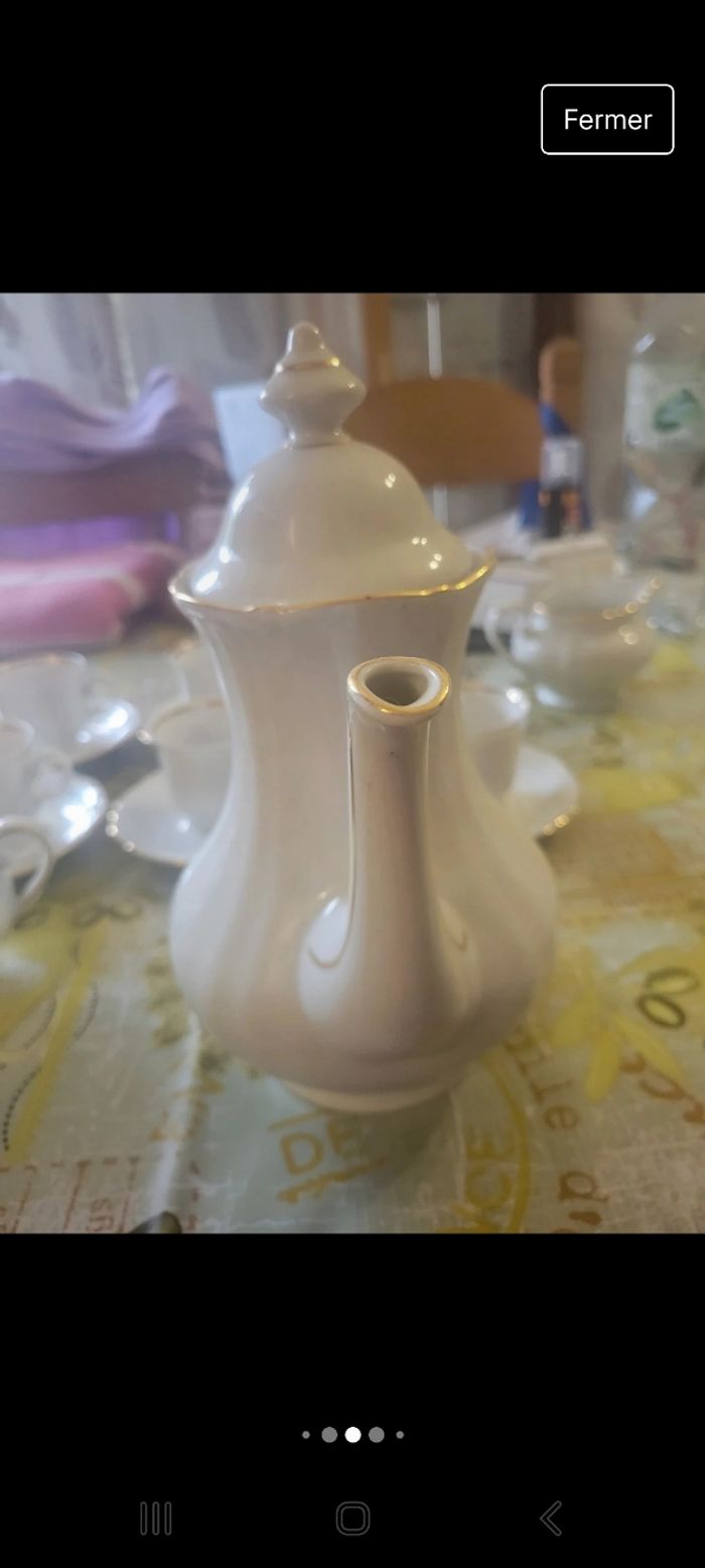 Magnifique service à café blanc avec un liserai doré sur les contours.en porcelaine. 6 tasses et sous tasses. 1 cafetière. 1 pot à lait .1 sucrier. Il appartenait à ma maman. Excellent état. Très peu servi.