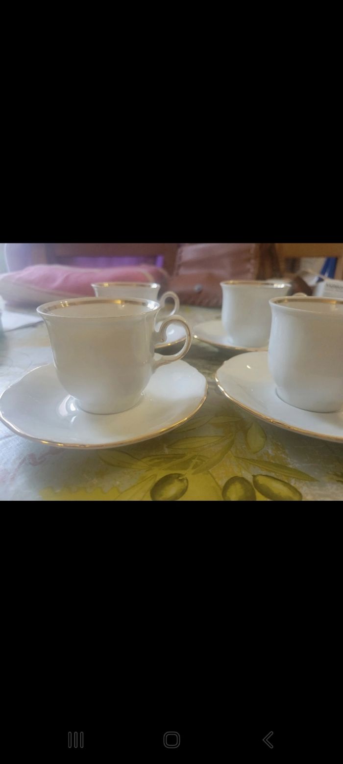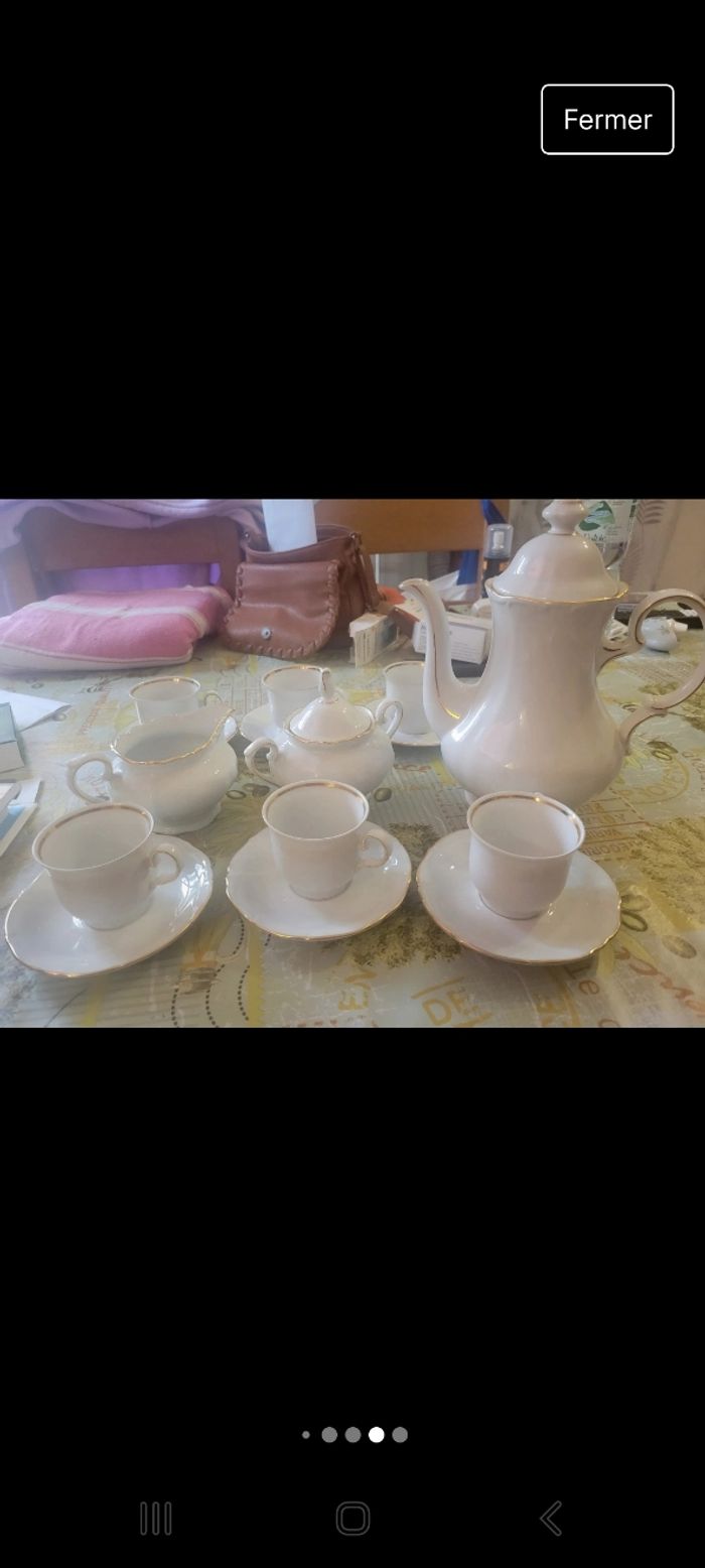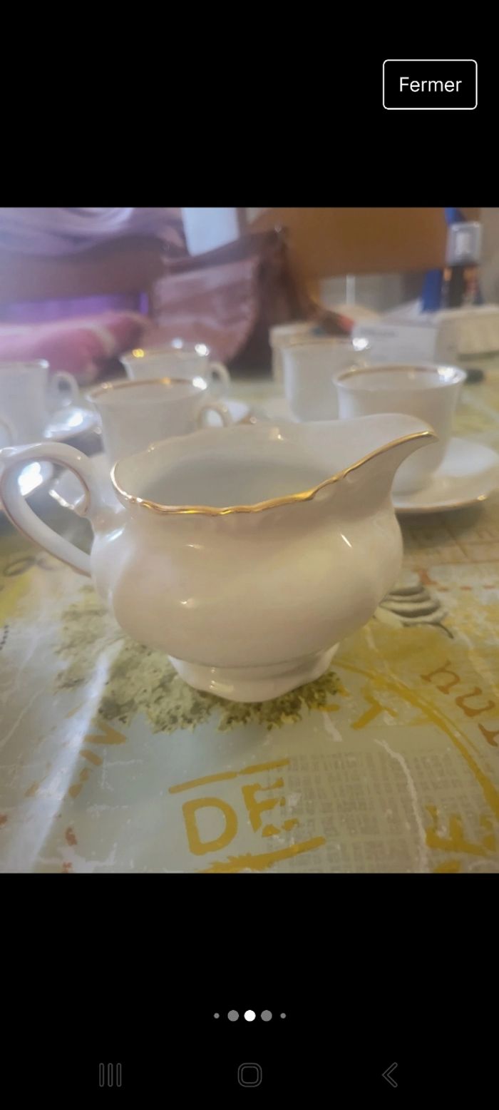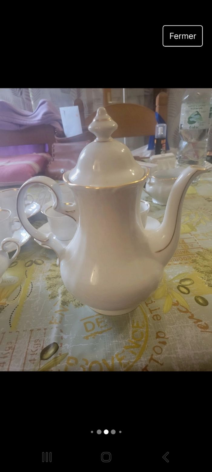 Magnifique service à café blanc avec un liserai doré sur les contours.en porcelaine. 6 tasses et sous tasses. 1 cafetière. 1 pot à lait .1 sucrier. Il appartenait à ma maman. Excellent état. Très peu servi.