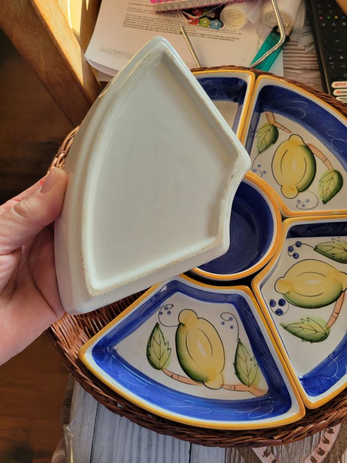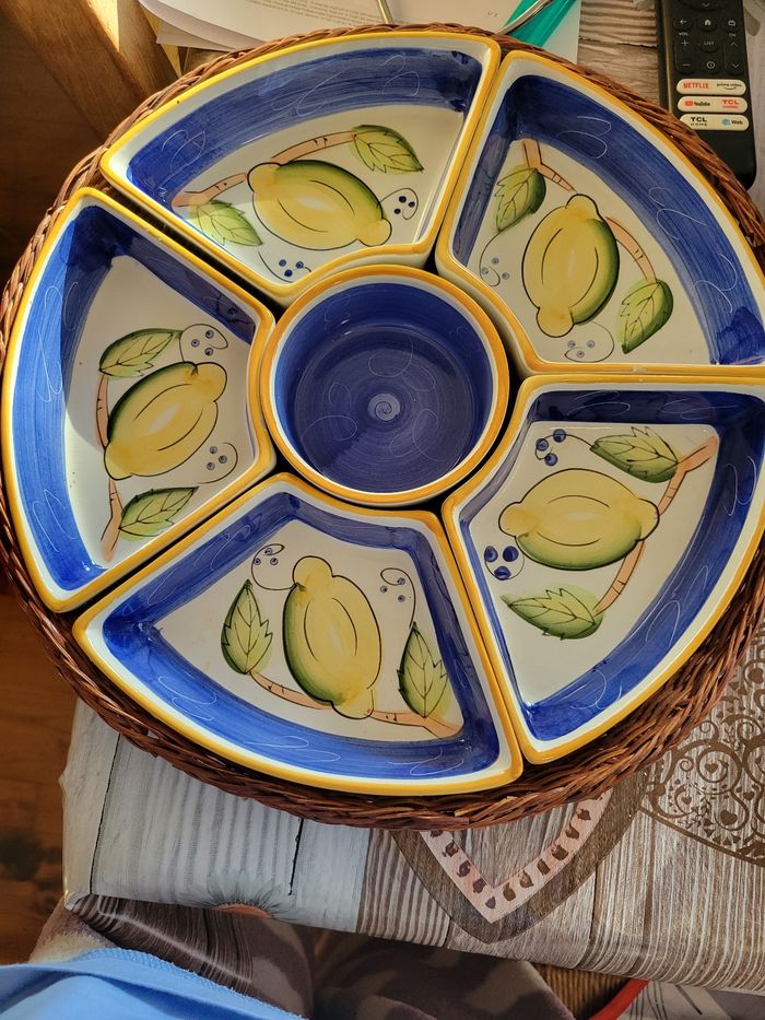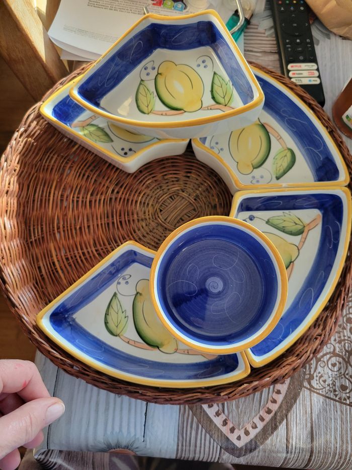 Jolie service apéritif. Amovible 6 compartiment sur plateau en osier. En grès. Idéal pour les fêtes ou soirée.