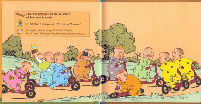 Heureusement, l'ordre des choses n'est finalement pas très bien rangé au pays des patinettes. Que l'idée même de compétition y soit désormais dérisoire et le bonheur devient l'affaire de tous. (dessins de bébés/adultes très mignons !)