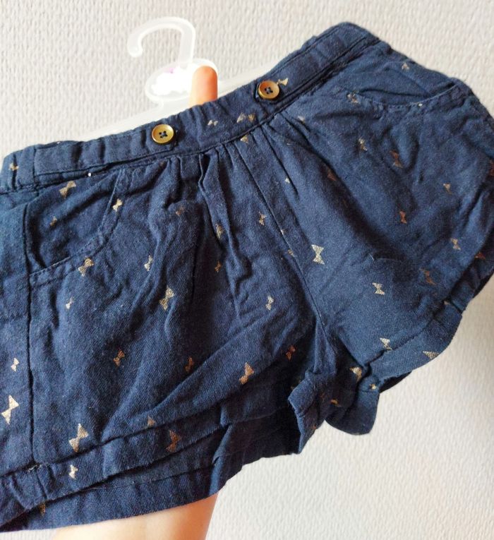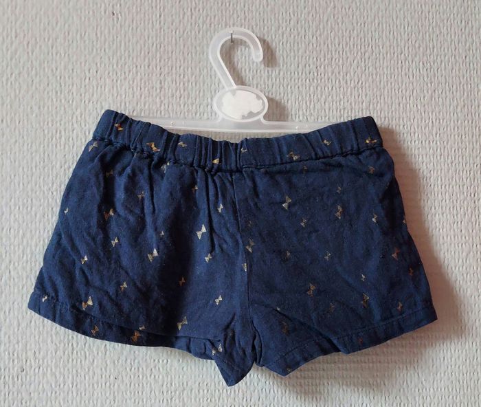 Je vends un short bleu foncé avec des nœuds papillon dorés venant de chez Tape à l'oeil. Taille : 12 mois/74 cm. En très bon état.