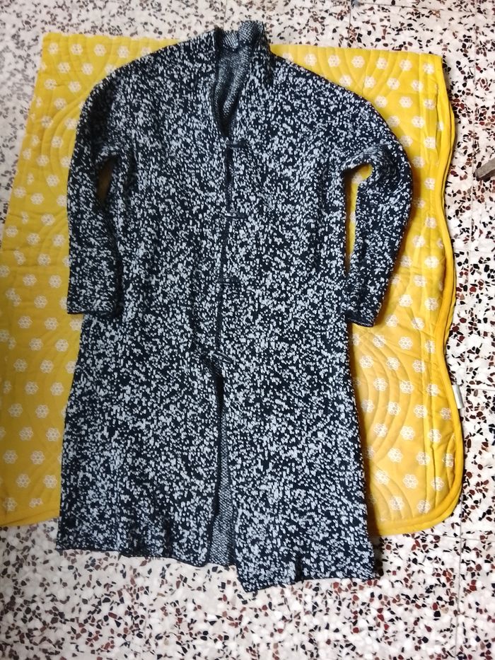 Bonjour, très belle veste a offrir pour Noël de la marque LC. Wainkiki en taille L en noir avec des dessins blanc a manches longues. 80% acrylque, 15% polyester , 5% elasthane . En très bon état et sans étiquette : hauteur devant : 94cm, Largeur : 26cm. Hauteur manche : 74cm, Largeur : 16cm. Pensez à vos cadeaux de fin d'année.