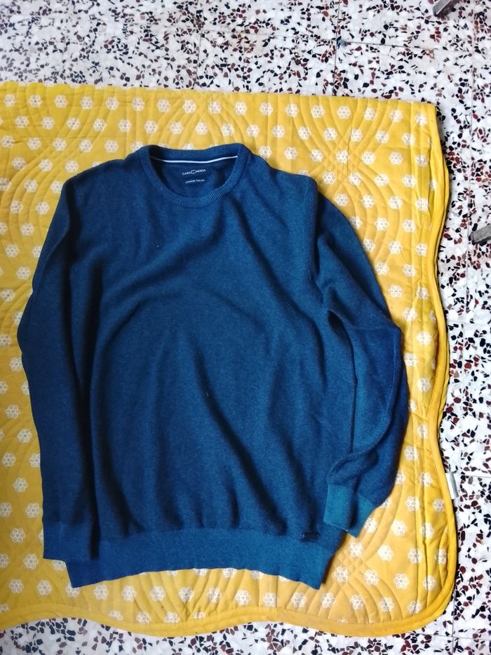 Bonjour, très beau pull a offrir pour Noël en bleu foncé de la marque Casa Moda en taille 42 a manches longues. 95% coton , 5% cachemire. En très bon état et sans étiquette : hauteur devant : 71cm, Largeur : 60cm. Hauteur manche : 61cm, Largeur : 18cm. Pensez à vos cadeaux de fin d'année.