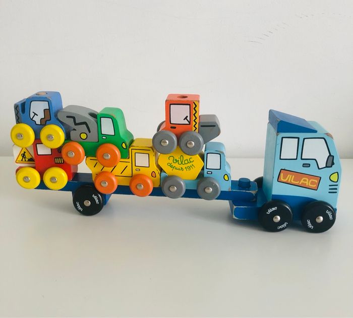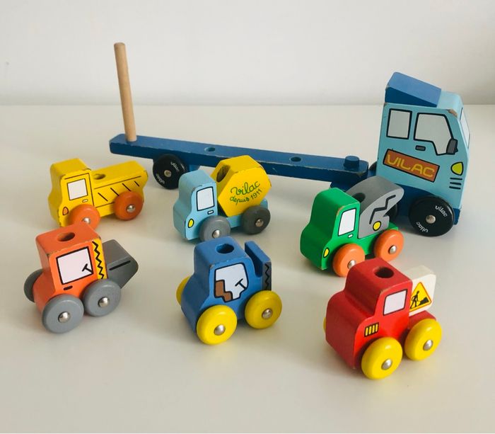 Je vends un camion remorque avec six voitures en bois. Il manque deux barres en bois sur la remorque du camion. Peinture enlevée par endroit.