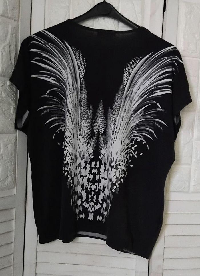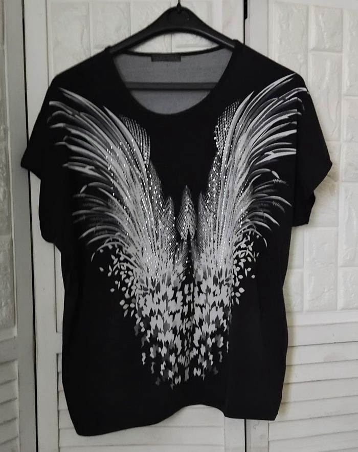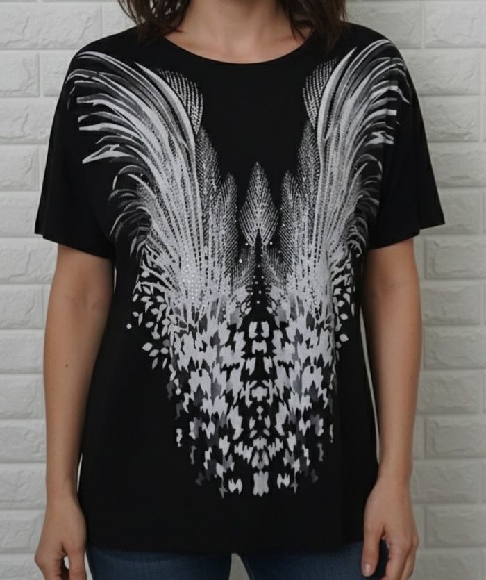 T-shirt de couleur noir avec motifs graphiques et symétrique sur le devant et au dos Ailes blanc et gris avec fines lignes blanches et pailletées sur le devant Longueur : 66 cm Longueur sous bras : 40 cm Longueur des manches : 28 cm Largeur aisselle à aisselle : 70 cm