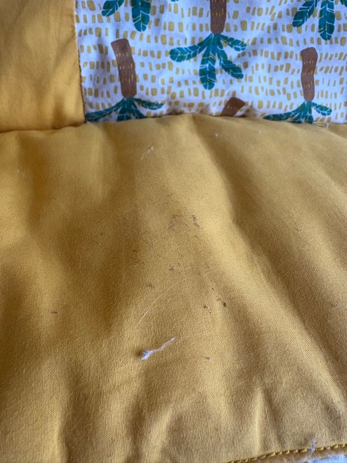 Est passé à la machine, dernière photo, une tache récalcitrante, présence de moumoute/bouloches qui parte avec de la patience, j’ai un chat il se peux qu’il y est quelques poils, mais j’en ai pas vu.