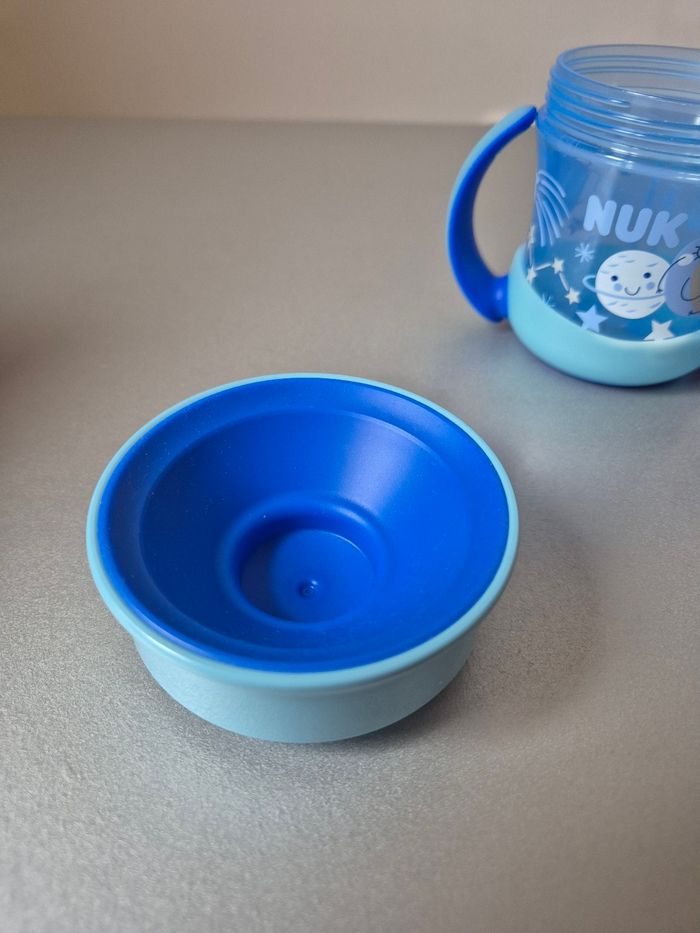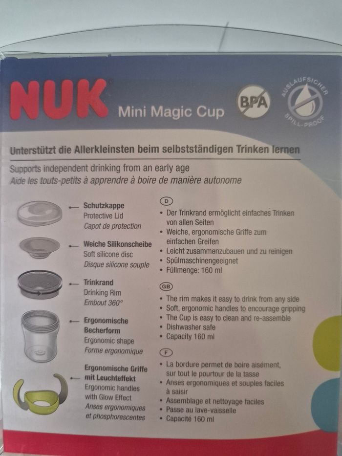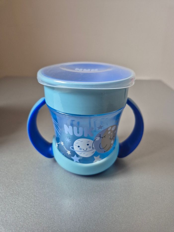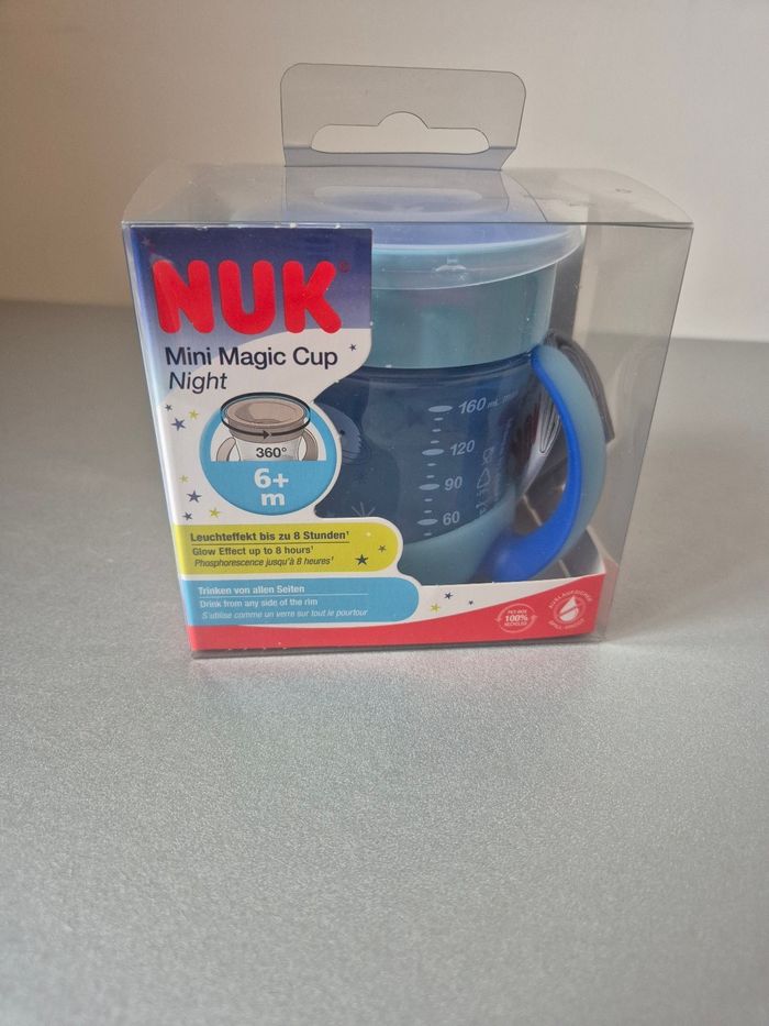 Tasse d'apprentissage NUK Je l'ai lavée après l'achat mais finalement nous ne l'avons jamais utilisée. Elle brille dans le noir.