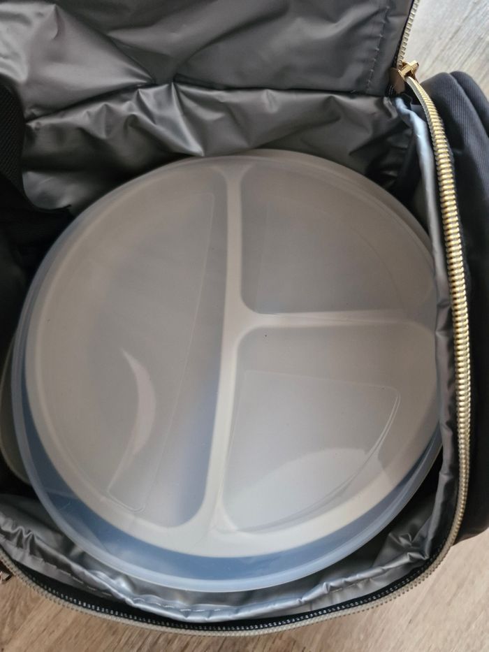 Coffret repas avec sac isotherme Une assiette ventouse compartimentée Un bol Une tasse d'apprentissage Des couverts Un bavoir Neuf ouvert juste pour les photos
