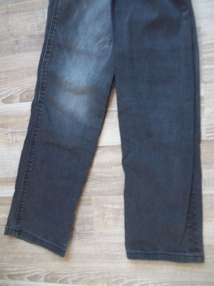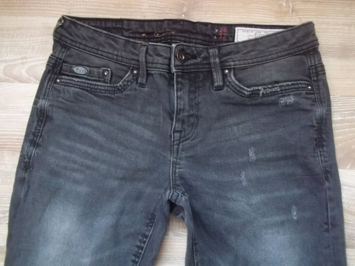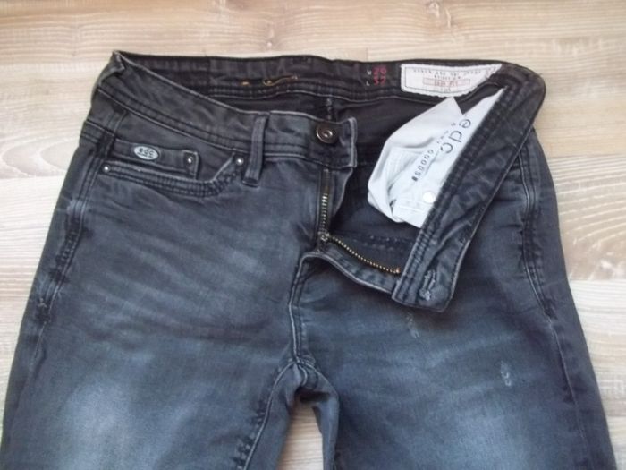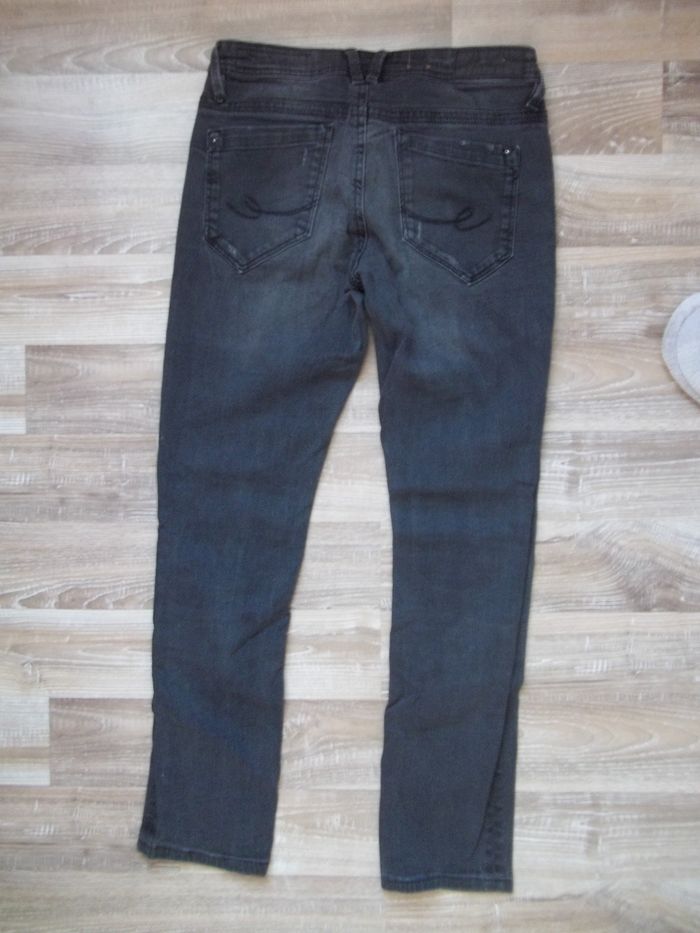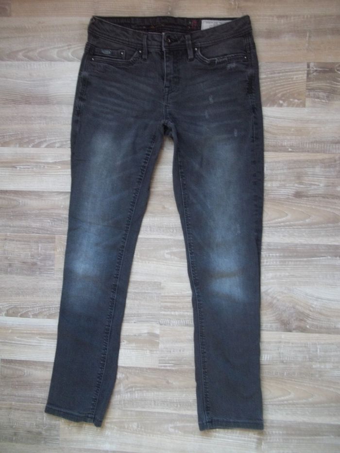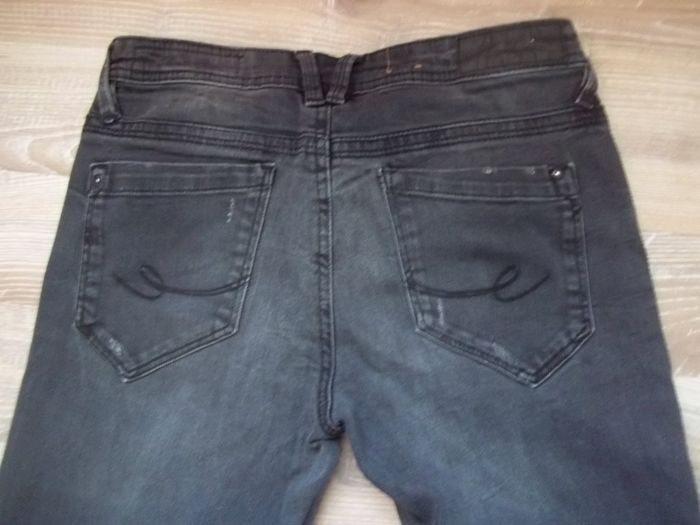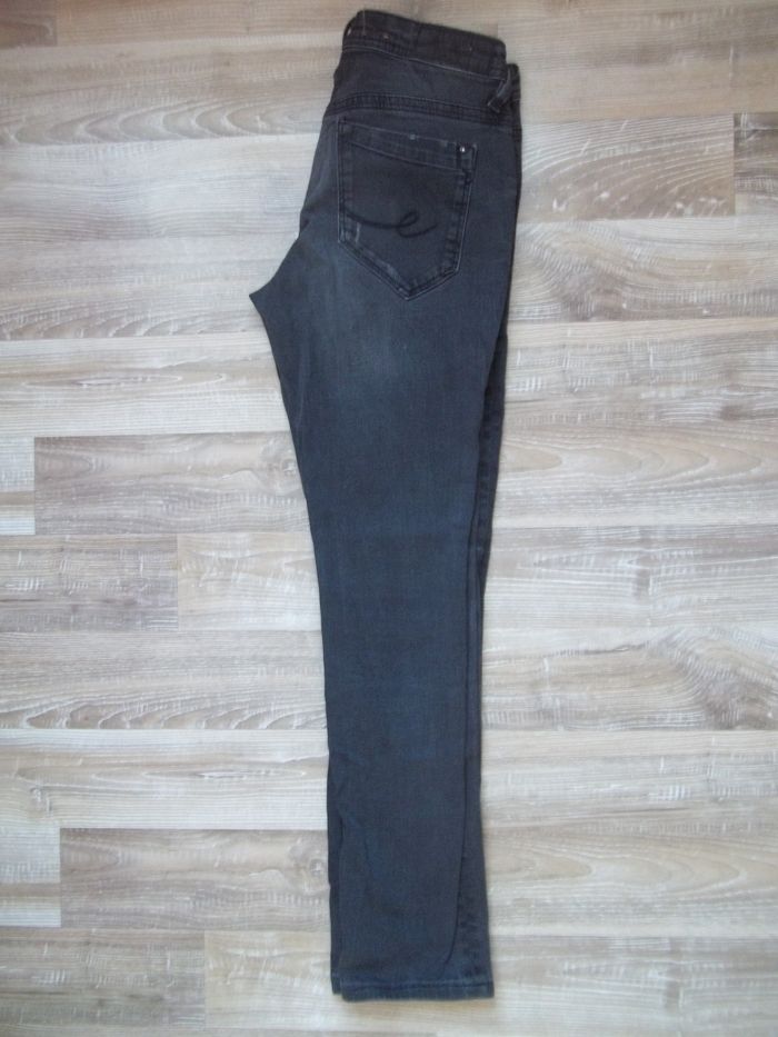 Jean 5 poches coupe Slim (98 % coton 2 % élasthanne), noir délavé et légers effets "troué"/"destroy" (légers : on ne voit pas dans les "trous"...). Fermeture zip et bouton, taille plutôt basse. Entrejambe 68 cm, hauteur totale sur côté 88 cm, largeur taille 35 cm, bas jambes 14/15 cm. Pant4