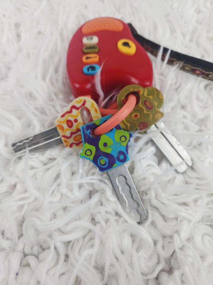 ✴️ Un trousseau de clé amusant au design réaliste, avec télécommande déclenchant des bruits de voiture et une lampe de poche. Le trousseau comporte 3 clés de différentes formes et couleurs, qui se balancent librement.