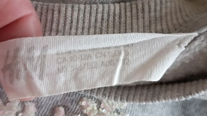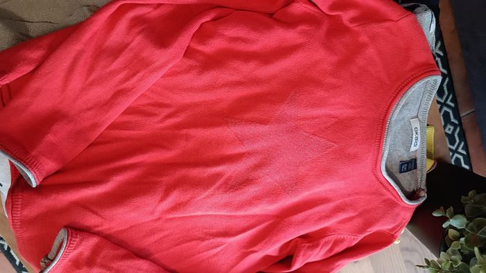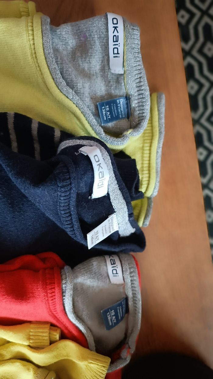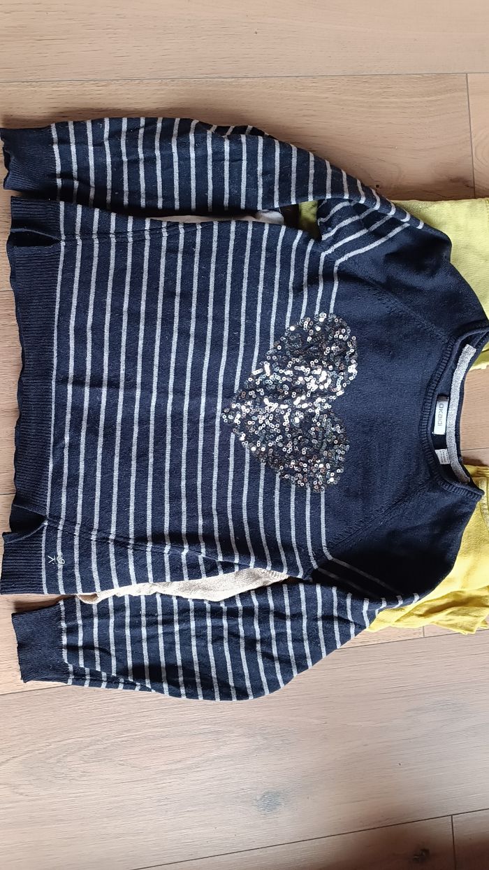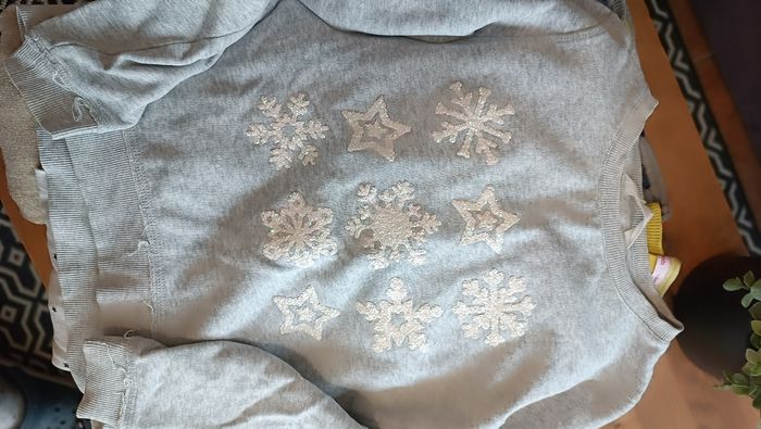 2 pulls couleur jaune, motifs étoiles brillantes, un de chez Okaïdi, l'autre de chez Gémo. Un marine rayures blanches et motif coeur sequins brillants et un gris avec motifs noël hiver neige, brillants. L'effet usé des fils au niveau du bas et des manches est d'origine ! Je l'ai acheté ainsi chez h&m.