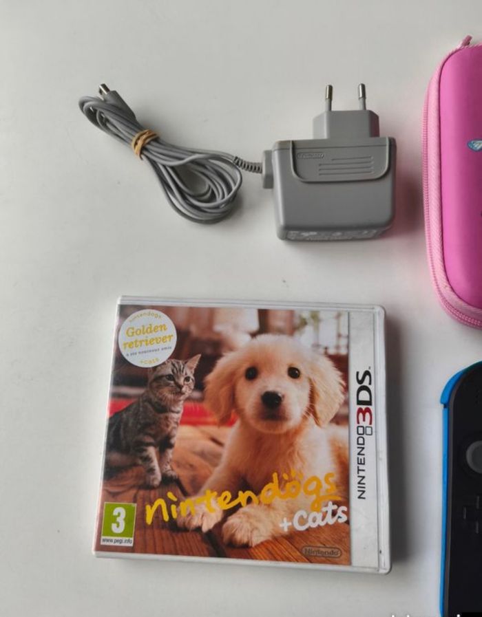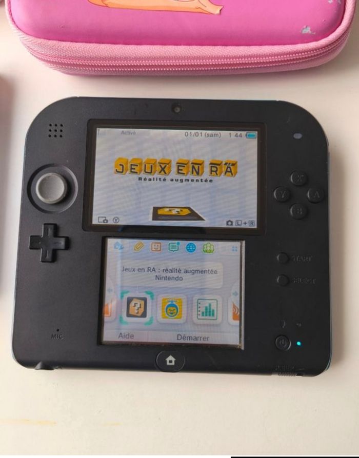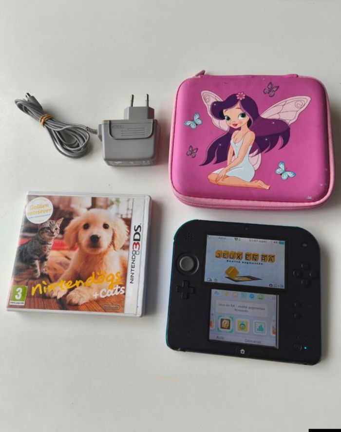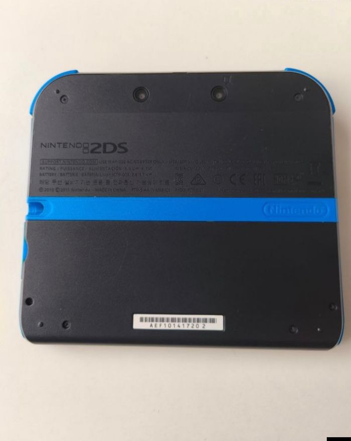 Lot Console Nintendo 2DS Bleu Noir fonctionnelle et plutôt en très bon état, quelques défauts : petites marques sur les écrans, stylet manquant, le chargeur est présent.