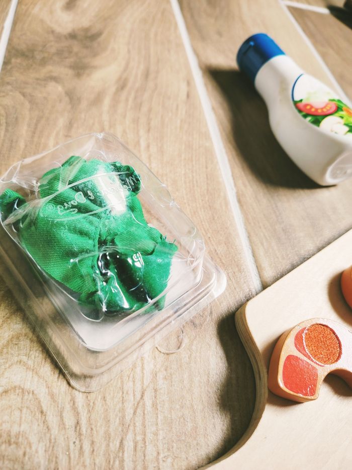 ✨Un plateau en bois et 2 tubes de sauce que votre enfant pour agiter et voir sortir un petit bout de ficelle faisant office de sauce.
