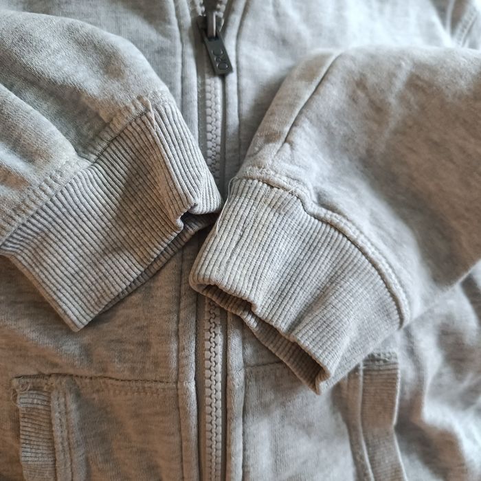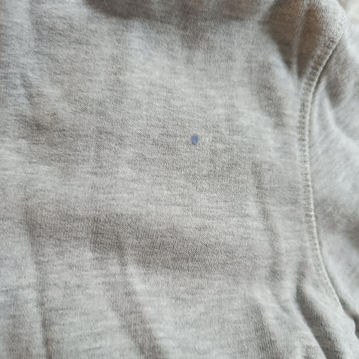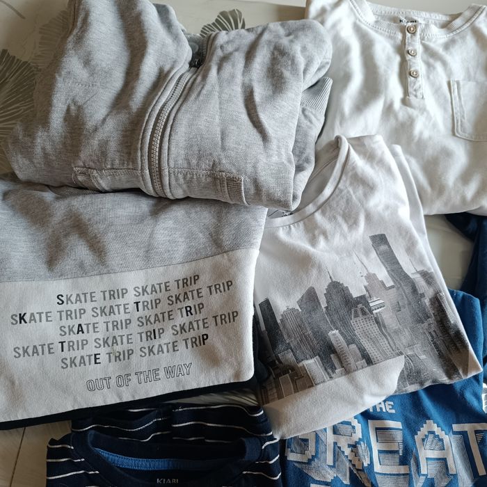 Bon état, le gilet gris a une tâche comme visible en photo, et les manches un peu jaunies. Il y a un haut à manches longues en taille 12 ans car niveau longueur il est court.