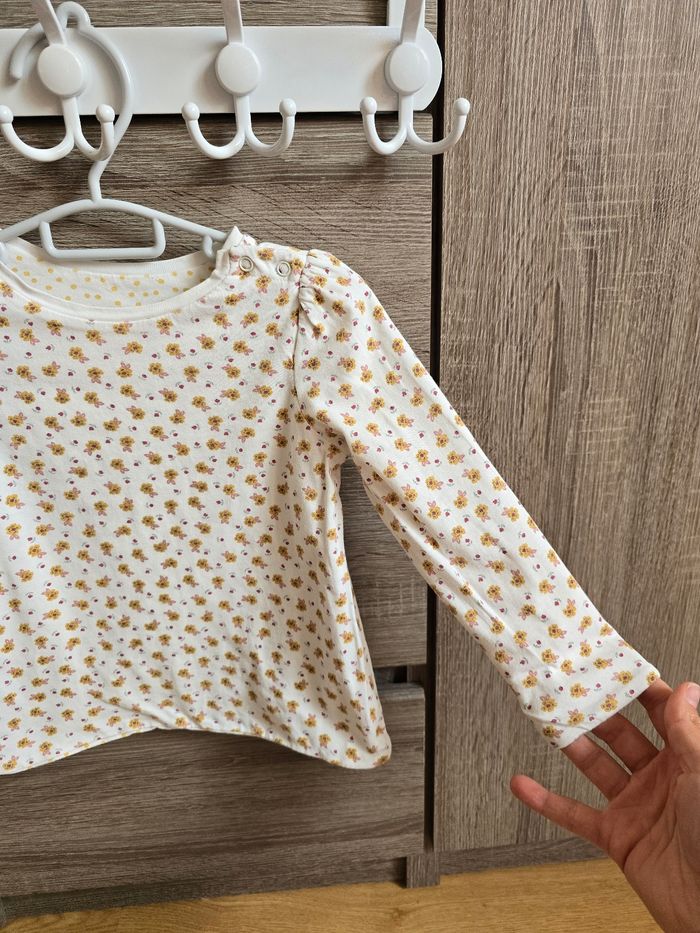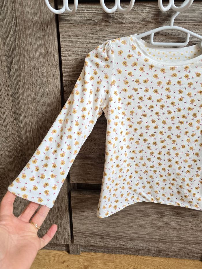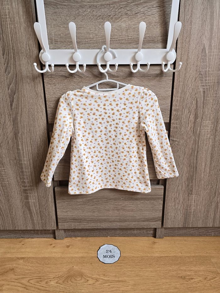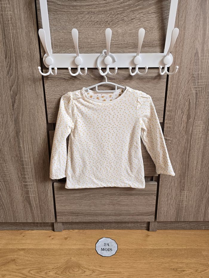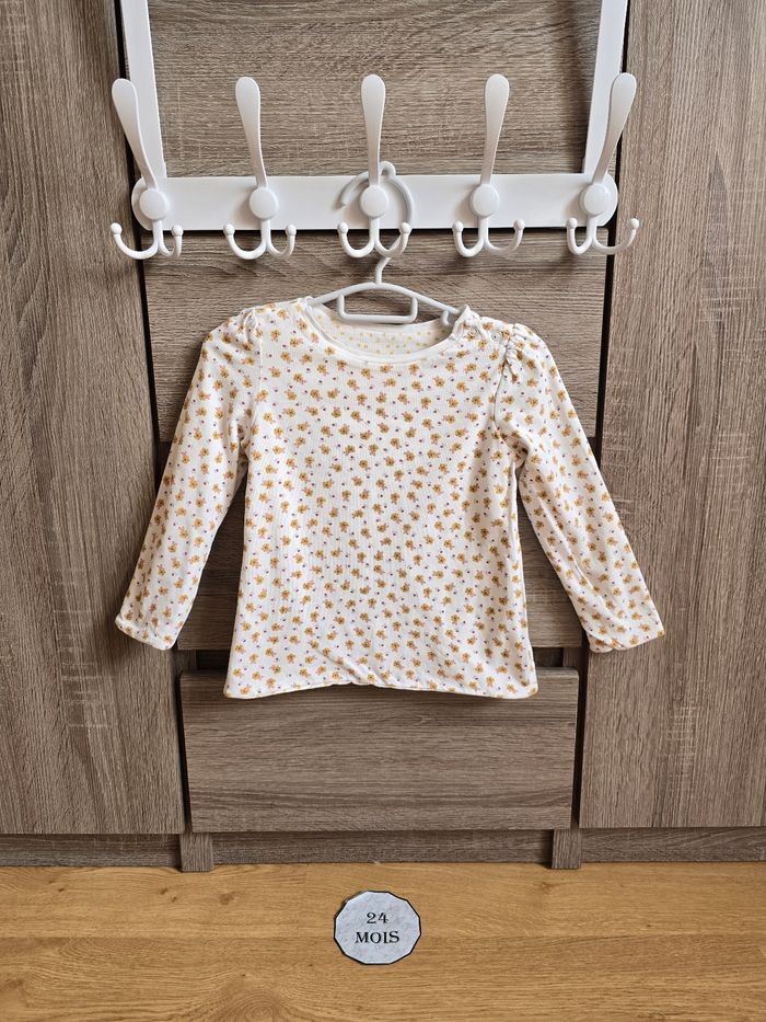 📜 T-shirt manches longues réversible, une face fleurie jaune et une face avec des points jaunes