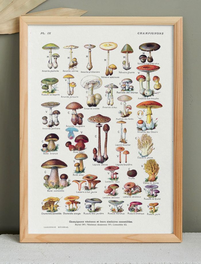 🍄 Affiche sur les champignons, d'après une lithographie d'Adolphe Millot datant de 1920. Cadre non fourni. Dimensions : 30 x 42 cm. Papier épais de haute qualité, 160gr. Envoyée bien protégée dans un tube solide.