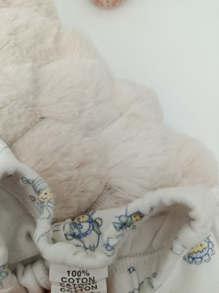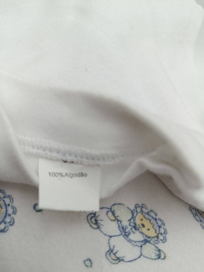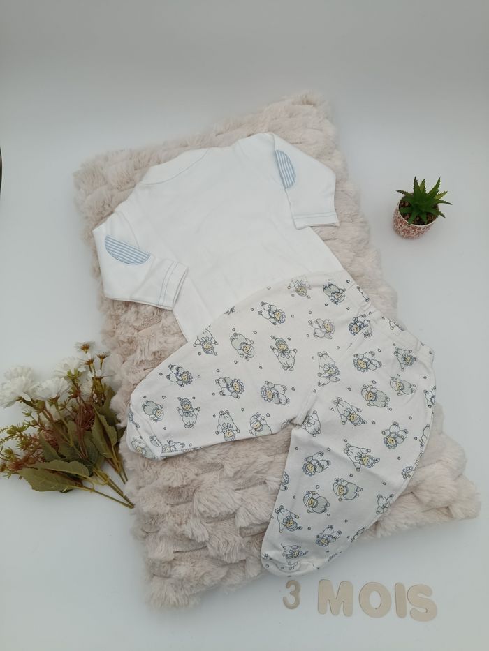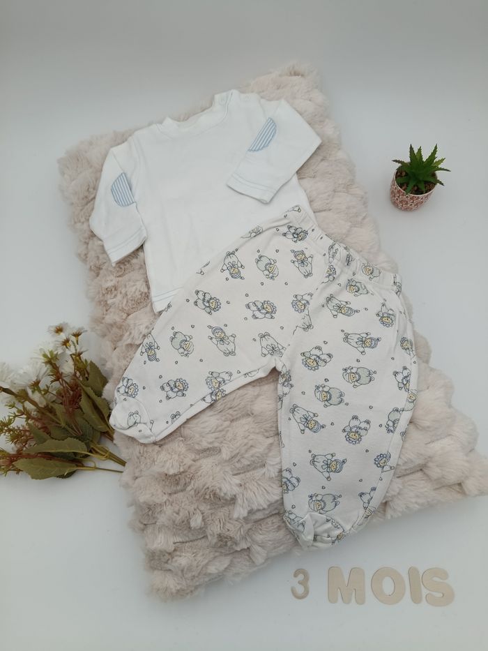 - Tee-shirt manches longues et pantalon à pied - Tee-shirt couleur blanc avec coudes rayés bleu clair et blanc - Pantalon couleur blanc avec dessin ourson - Pressions sur l'épaule - Aucune tâche ni trou
