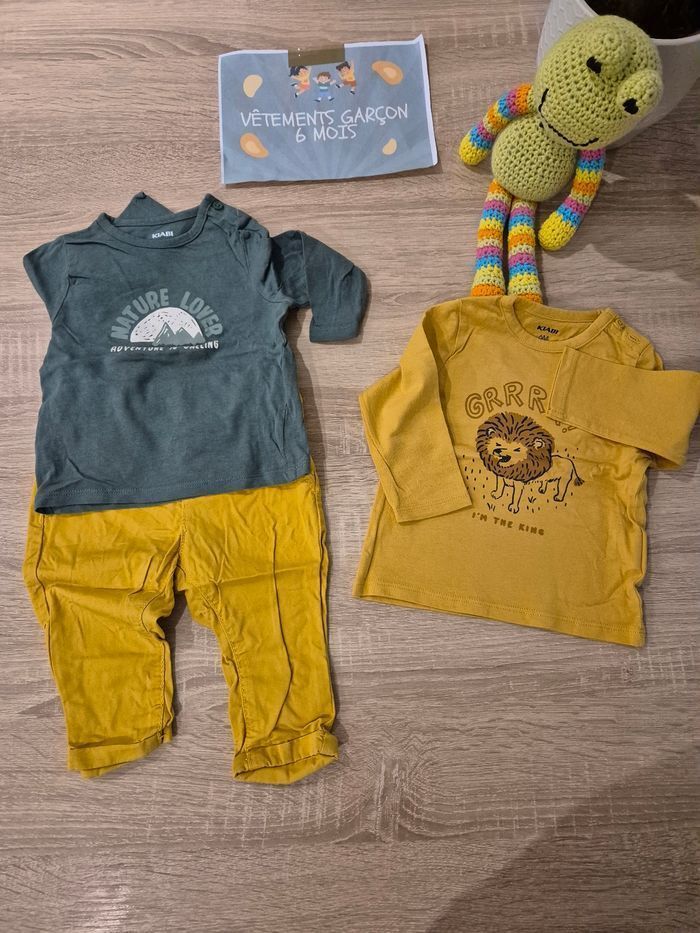 Ensemble 3 pièces mi-saison pour bébé Comprenant : pantalon et 2 tee-shirts ML assortis Marque : KIABI Taille : 6 mois En très bon état Lavé et stocké dans caisse plastique Maman soigneuse et envoi rapide N'hésitez pas à consulter mon dressing, faire des lots ou me contacter 😉