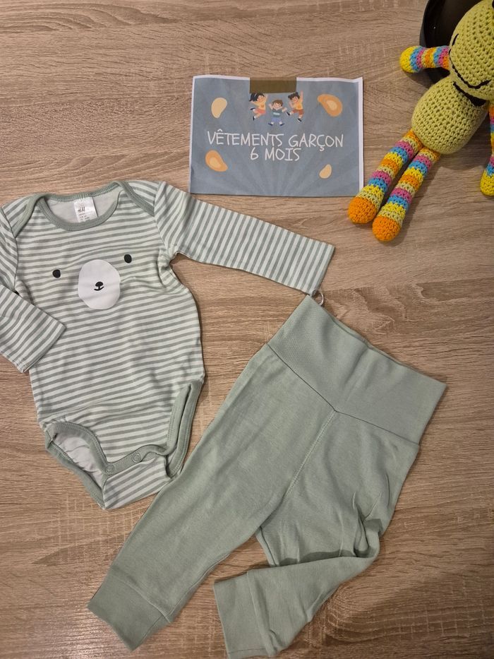 Ensemble 2 pièces mi-saison pour bébé Comprenant : pantalon legging et body ML assortis Marque : H&M Taille : 6 mois En très bon état Lavé et stocké dans caisse plastique Maman soigneuse et envoi rapide N'hésitez pas à consulter mon dressing, faire des lots ou me contacter 😉