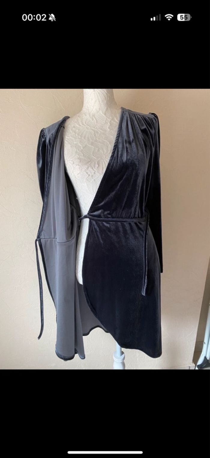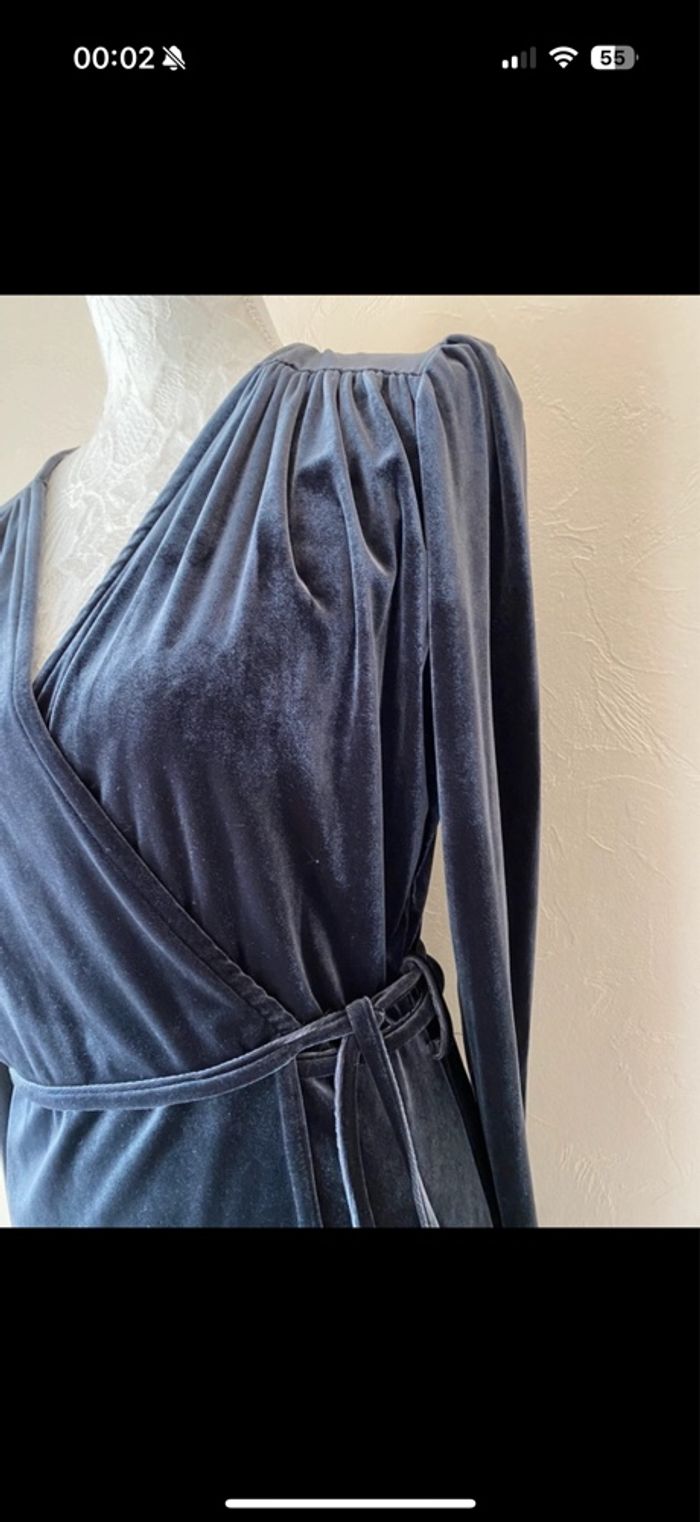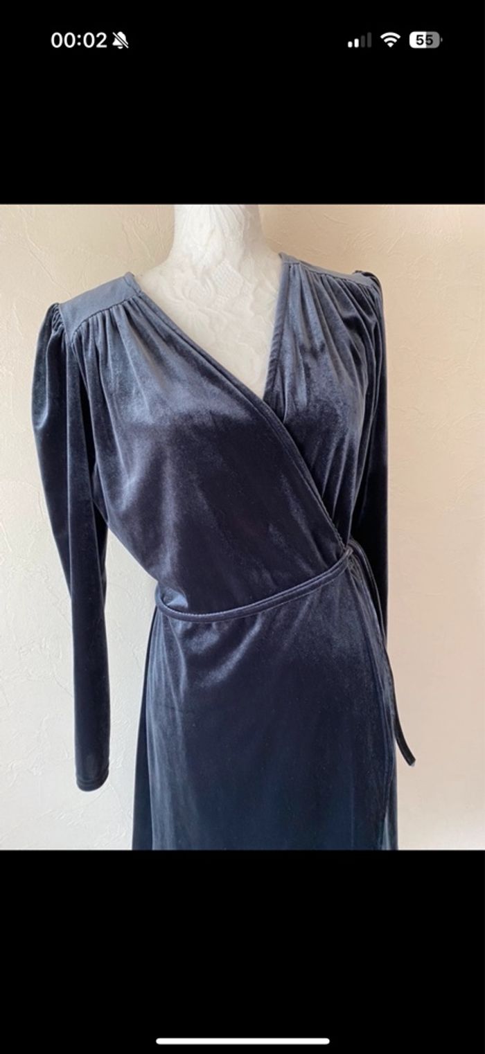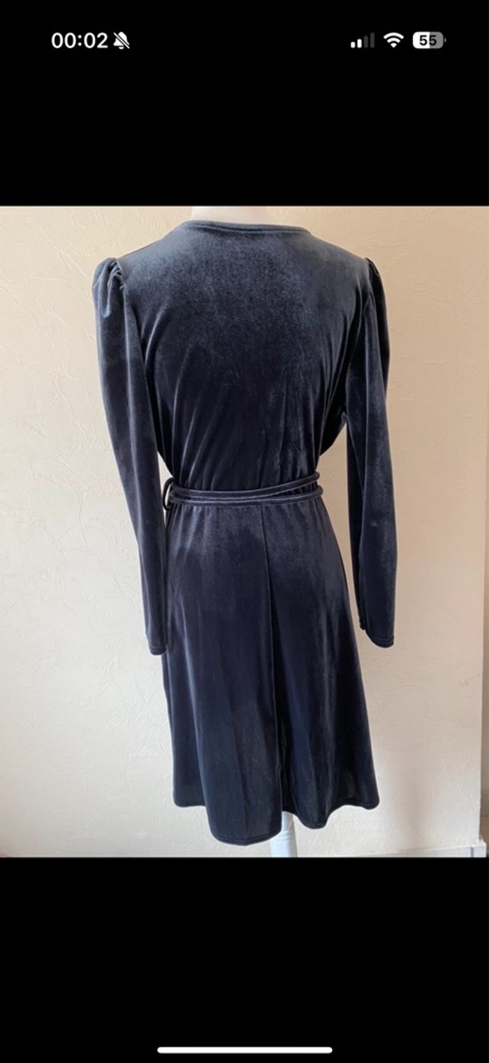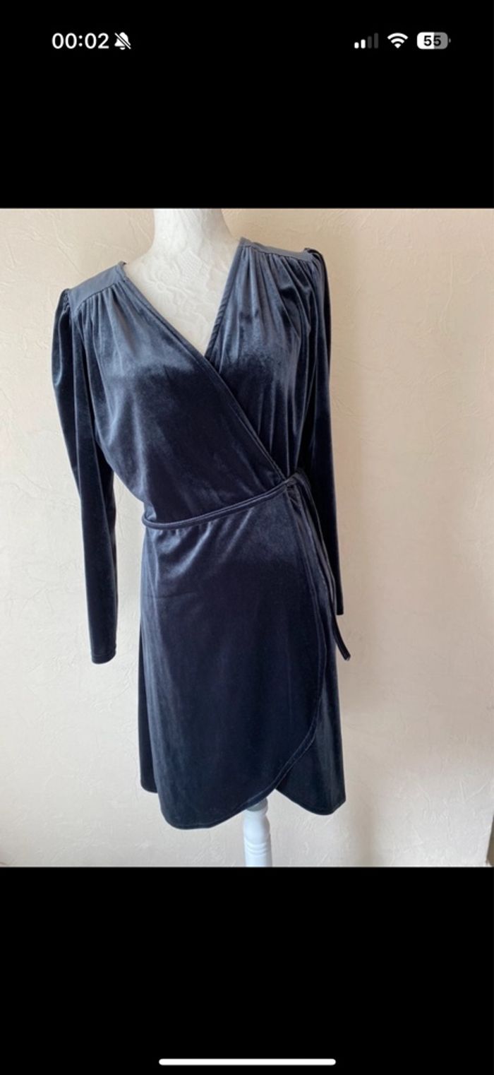 👗 Robe cache-cœur à nouer 💙 Couleur : Bleu marine 📏 Taille : L 📐 Aisselle à aisselle : 48 cm 🩶 Tissu doux façon velours, très agréable à porter 💫 Coupe élégante et féminine, parfaite pour une soirée ou une occasion spéciale 🧼 En très bon état