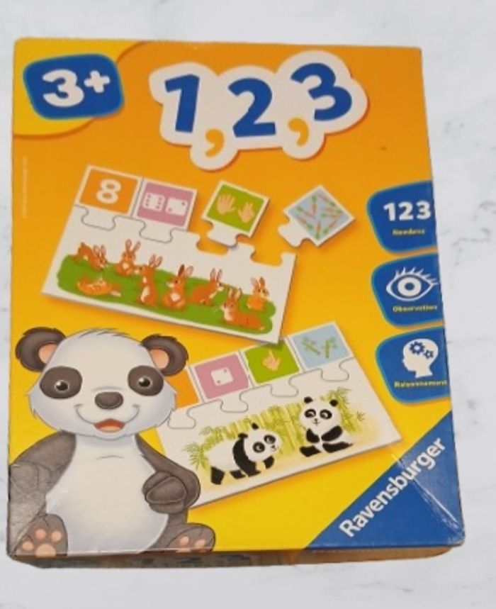 Je vends ce jeu d'association éducatif de la marque Ravensburger, idéal pour apprendre aux enfants de 3 ans et plus à compter et à reconnaître les quantités de 1 à 10.