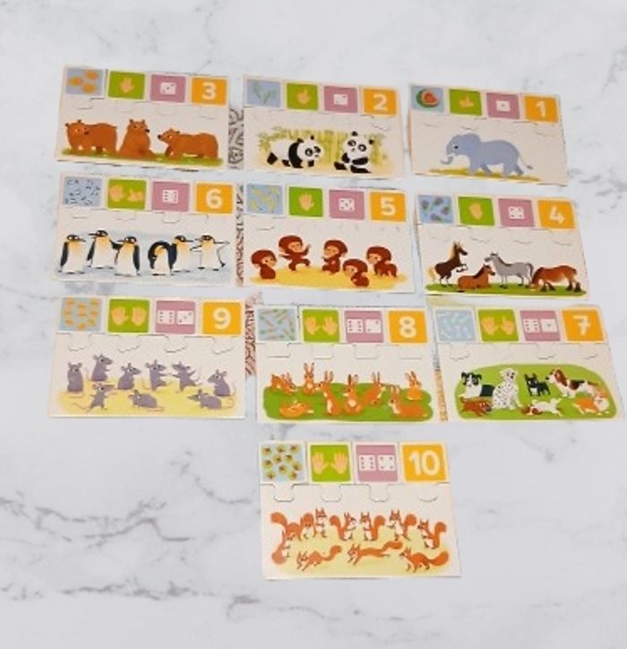 10 puzzles de deux pièces (une grande image animale et les 4 cartes à associer : objets/nourriture, dés, main, et chiffre).