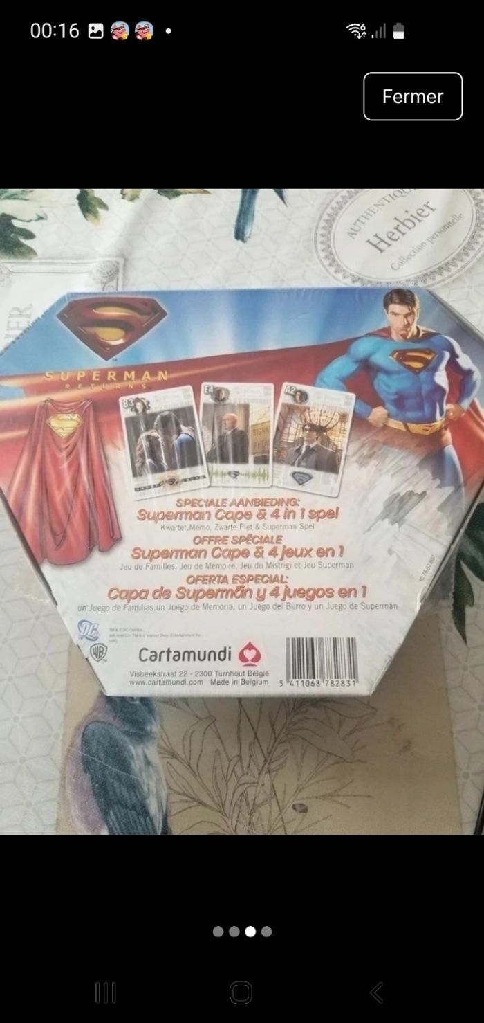 Voici une valise Superman vraiment unique ! Elle contient 4 jeux en 1 ainsi qu'une cape de Superman. Le tout est complètement neuf et n'a jamais été utilisé. Cette valise est parfaite pour les fans de Superman qui veulent s'amuser et se divertir pendant des heures. Avec ses jeux variés et sa cape emblématique, elle fera le bonheur de tous.