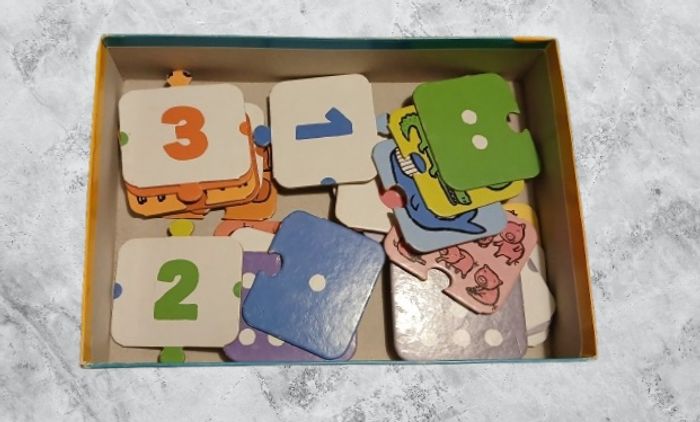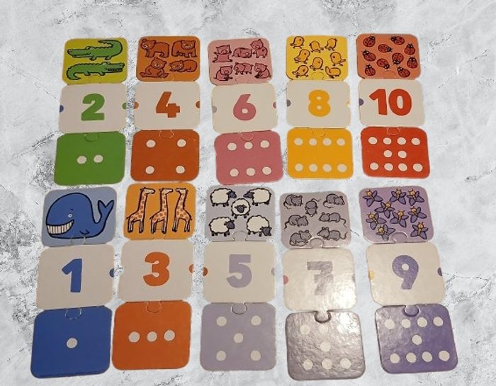 30 pièces de puzzle (format 5 \times 6,8 cm) : 10 chiffres, 10 quantités d'animaux, et 10 représentations de dés.