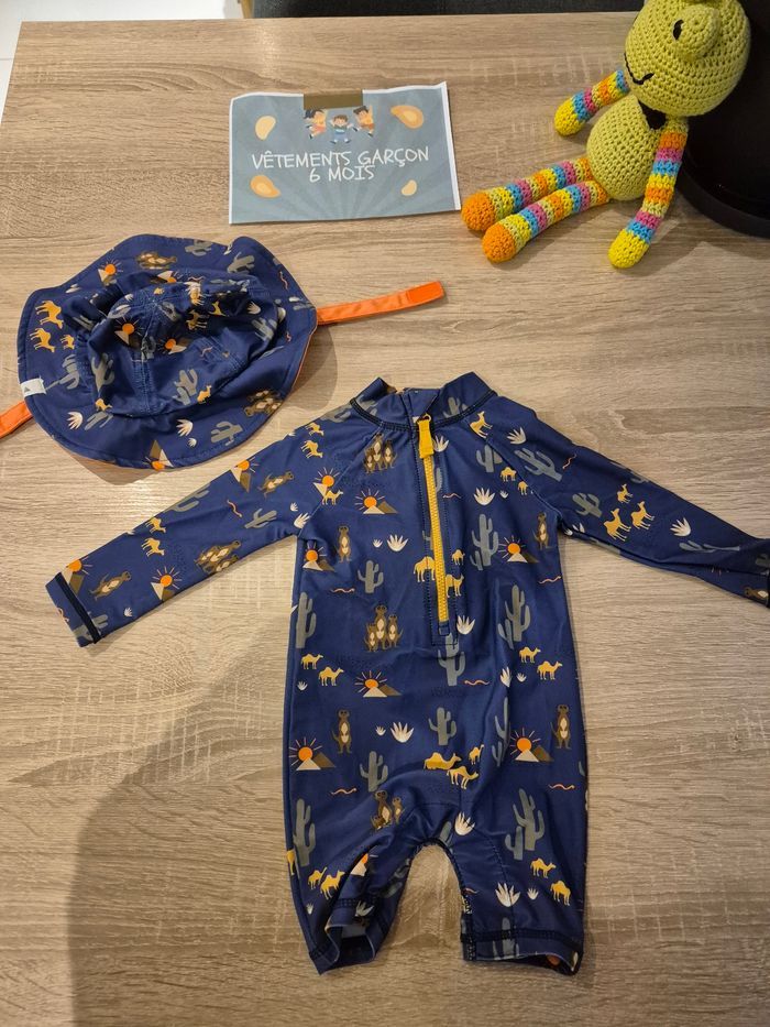 Combinaison de bain bébé avec son chapeau assorti UPF 50+ (encore vendu neuf 18€ sans le bob) Marque : TAO Taille : 6 mois En très bon état Linge lavé et stocké dans caisse plastique Maman soigneuse et envoi rapide N'hésitez pas à consulter mon dressing, faire des lots ou me contacter 😉