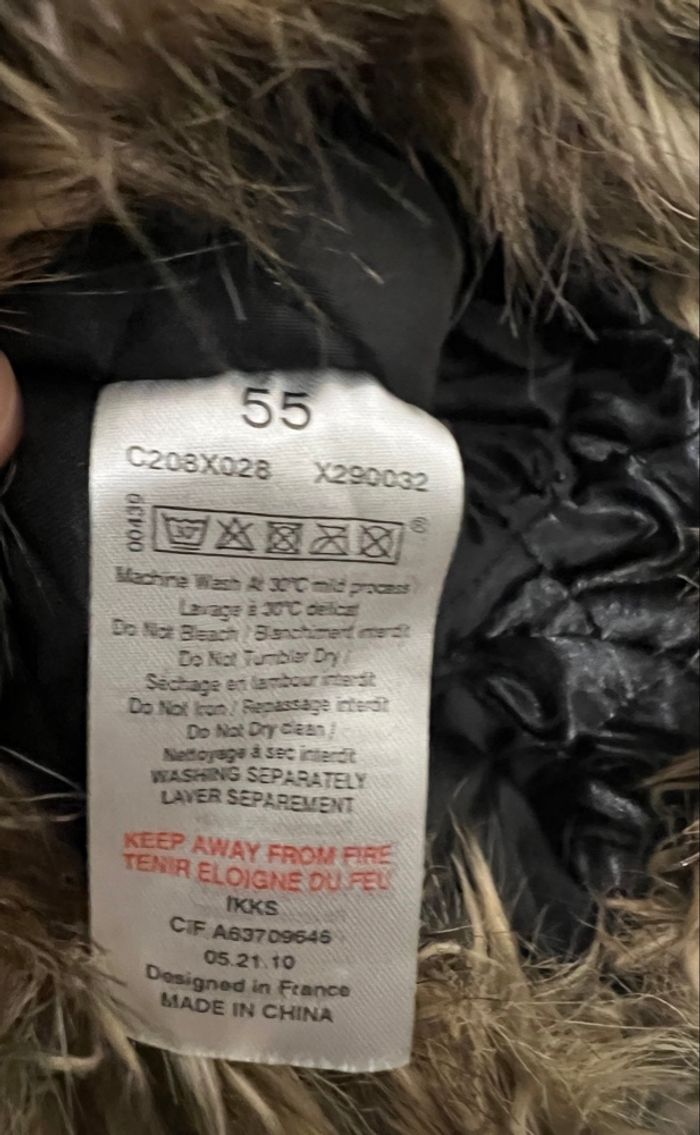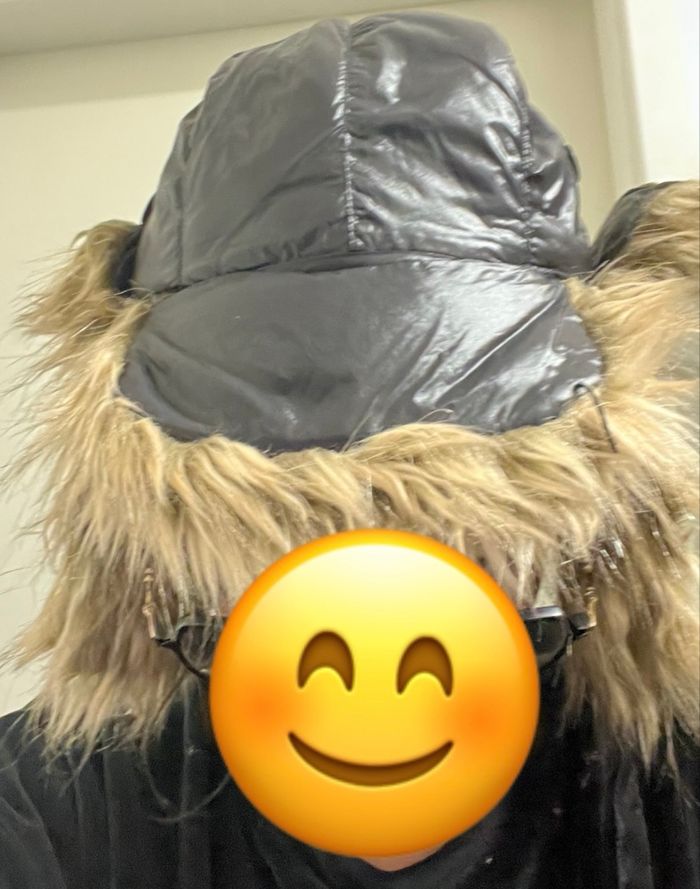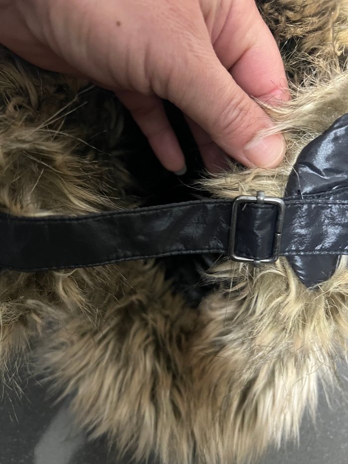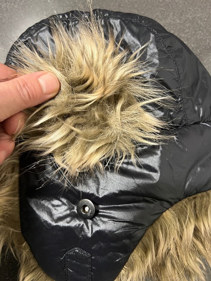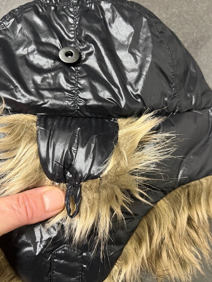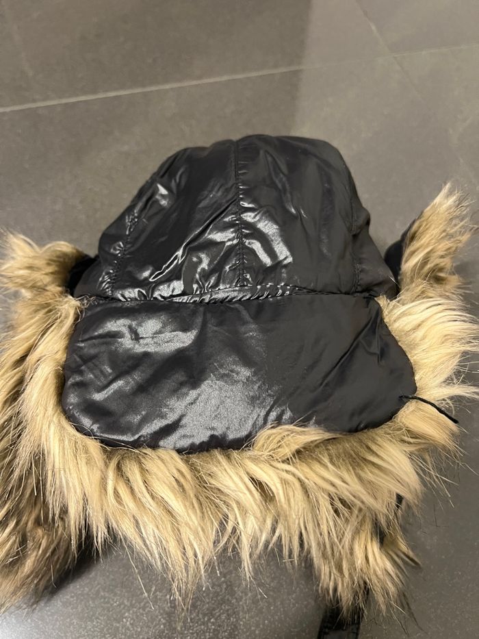 Couleur noir (effet doudoune/nylon) avec fausse fourrure dans des tons beige/marron, aspect visière devant aui peut se rabattre ou se relever pour voir la fourrure