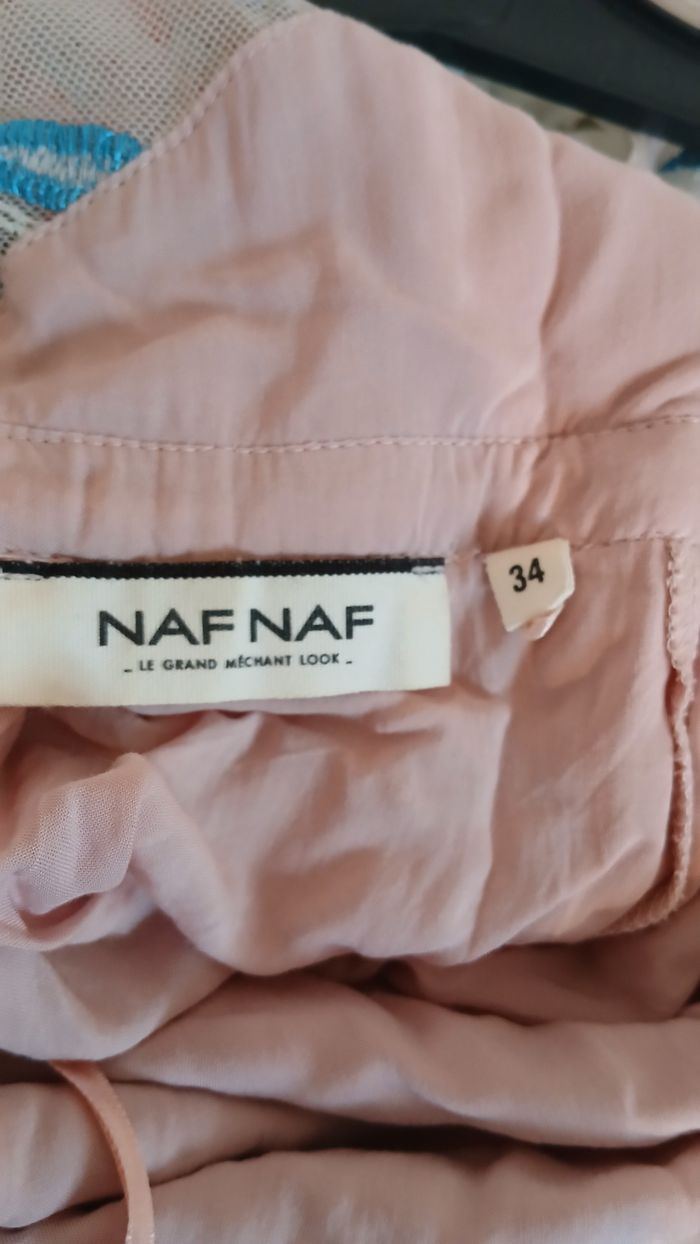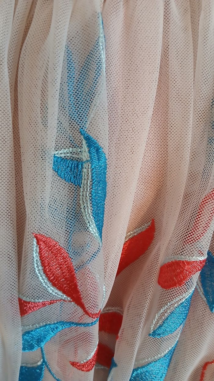 Couleur : Tissu rose poudré avec de belles broderies bleu turquoise et corail.