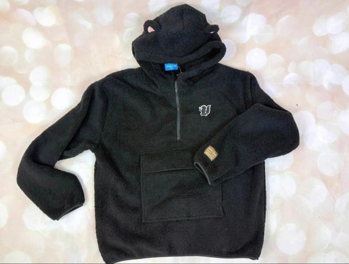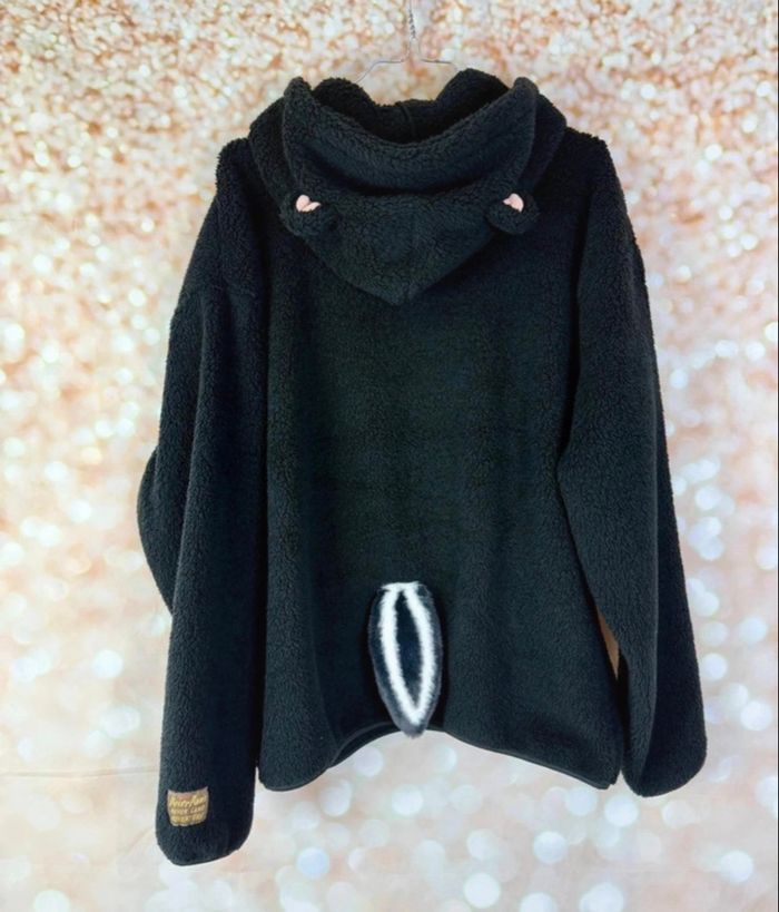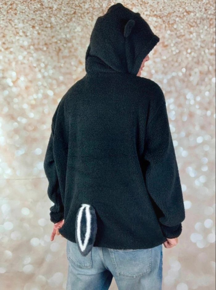 La capuche est ornée d’oreilles, et au dos est accroché une queue.