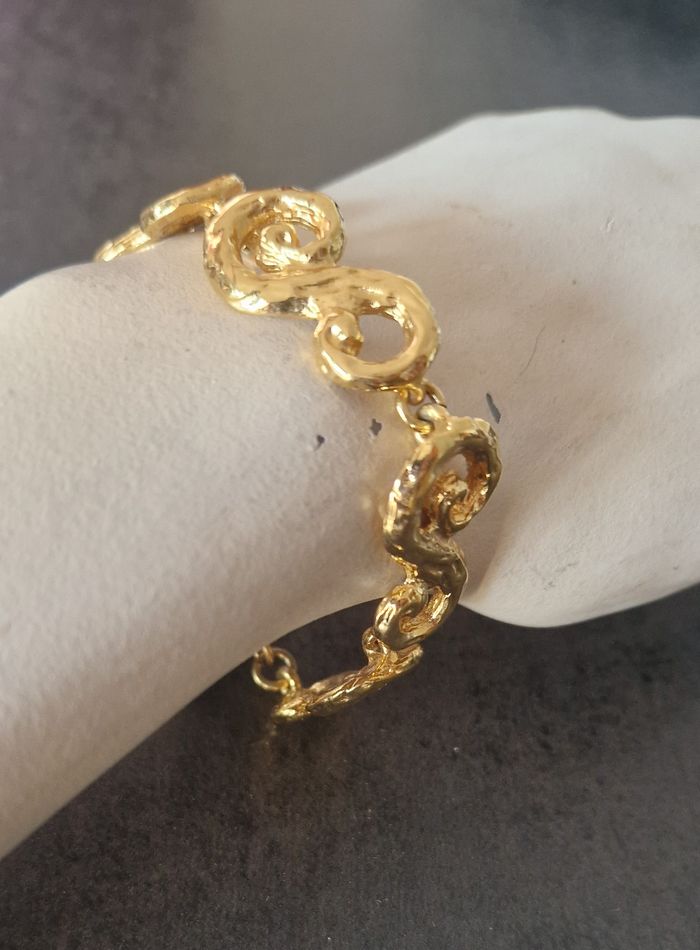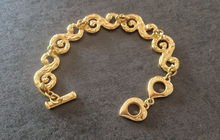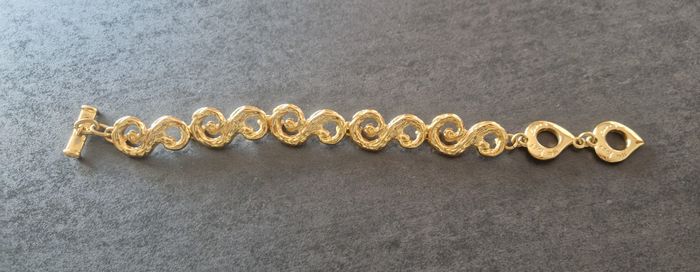 MERCI DE ME CONTACTER AVANT TOUT ACHAT. Magnifique et authentique bracelet vintage Yves Saint Laurent conçu du vivant du designer, en métal doré, fermoir à bascule siglé. Vendu dans son pochon d'origine en velours siglé si acheté seul ou dans la boîte Yves Saint Laurent Collection en cas d'achat de la parure. Excellent état ! Autres modèles de bijoux ou vêtements YSL dans mes annonces.