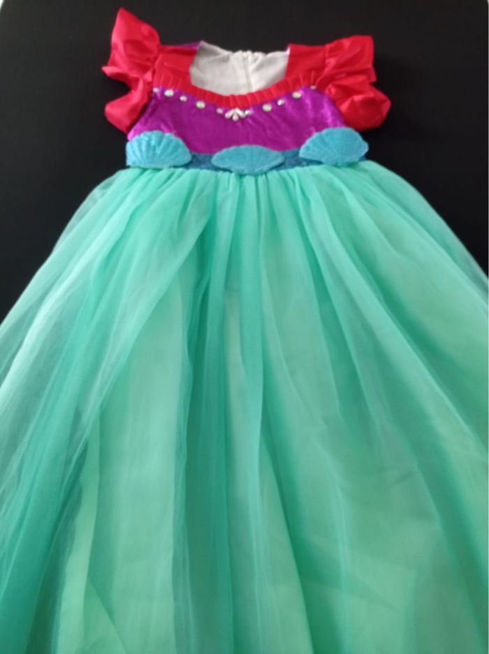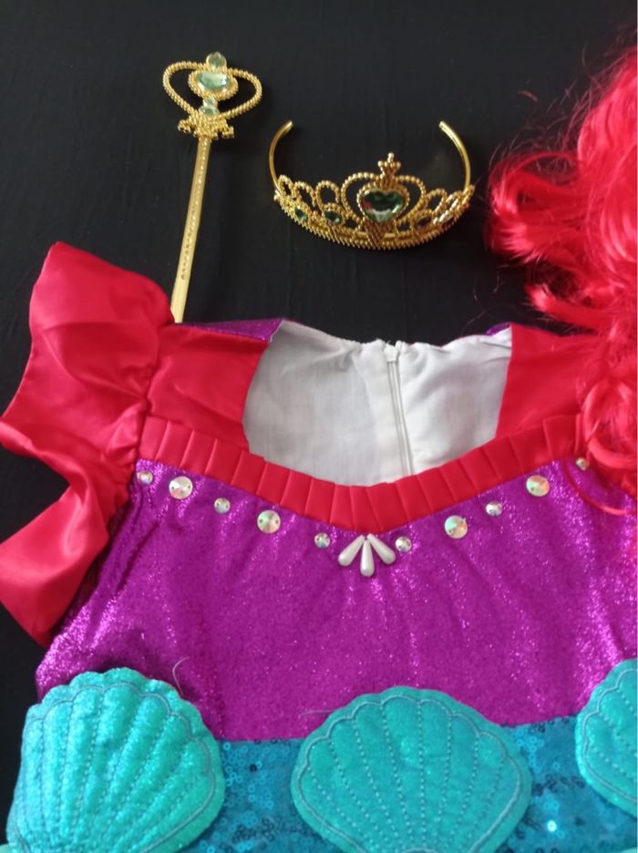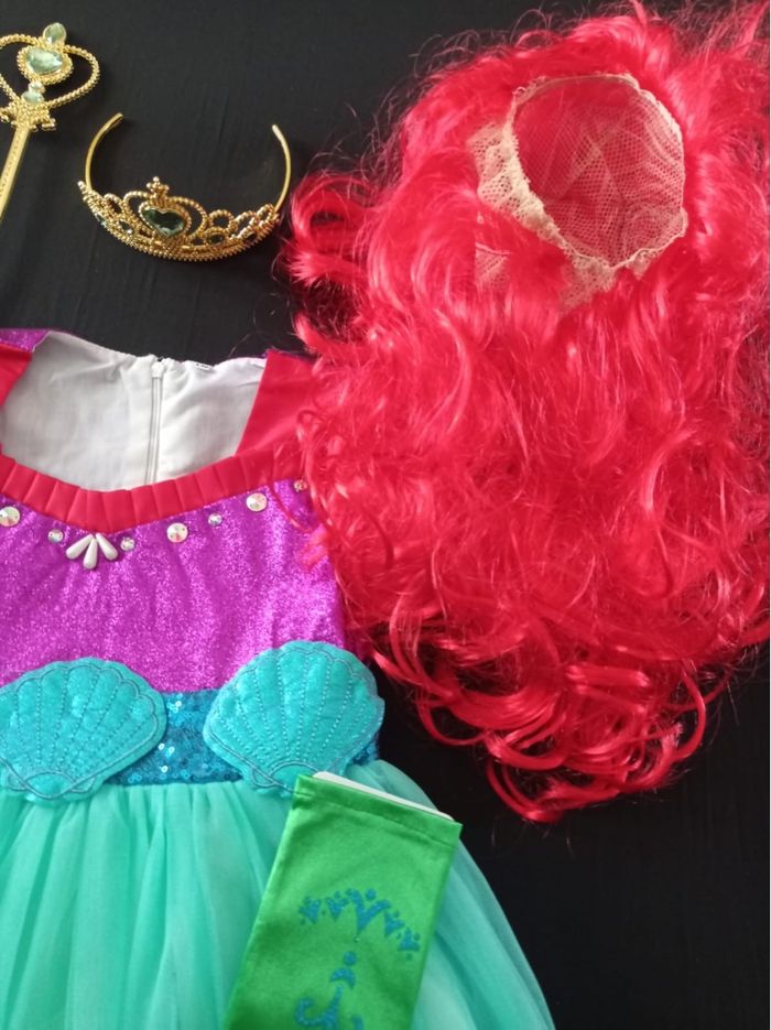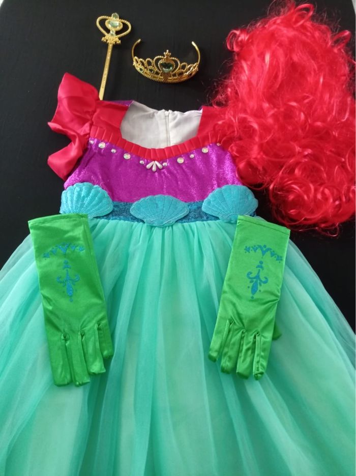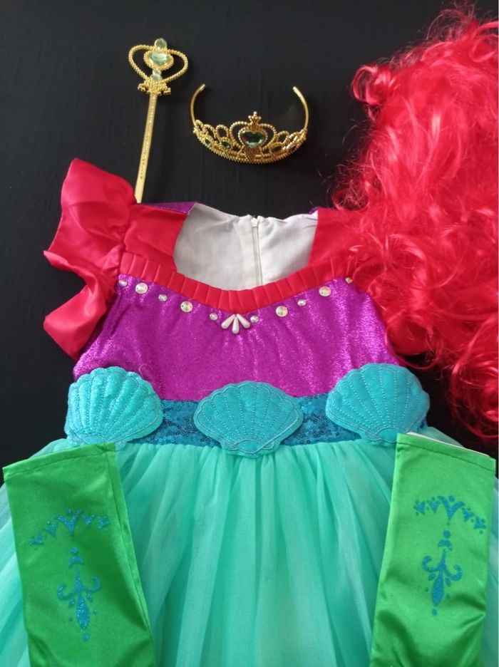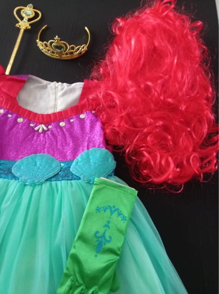 Déguisement robe princesse sirène et ces accessoires (couronne, baguette, gants, perruque, noeud). La robe mesure 90cm de longueur, la taille convient aux petites filles de 6ans. Totalement neuve, vendue dans son emballage d’origine. Expédition rapide après votre commande
