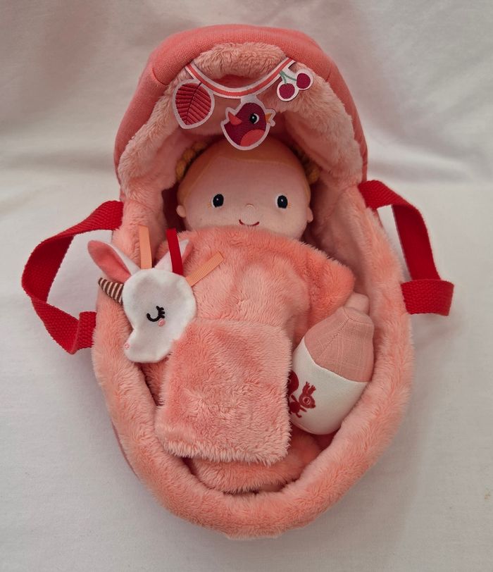 1 couffin qui mesure 28 cm env en tissu lange de couleur rose et a l'intérieur en velours fourrure de couleur rose.