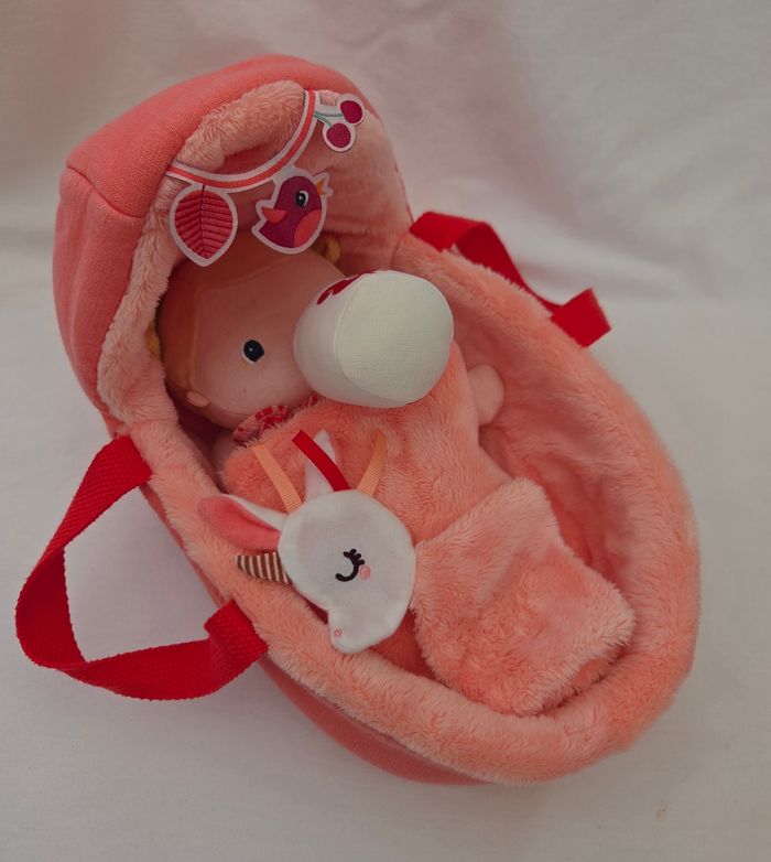 Doudou poupée bébé Lena qui mesure 26 cm env en tissu rembourré de couleur rose saumon.