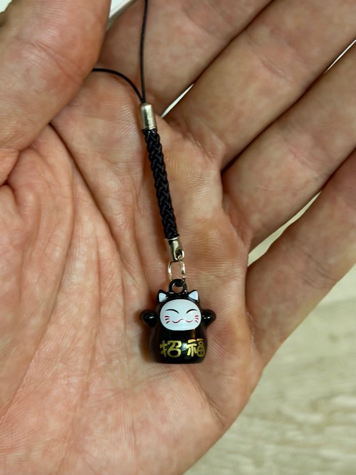 Adorable petit porte-clé / charm Maneki Neko noir, symbole traditionnel japonais de chance et de prospérité.