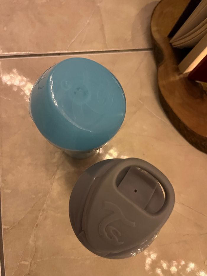 Système anti-fuite avec paille intégrée (modèle gris) et bec verseur (modèle bleu).