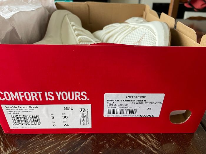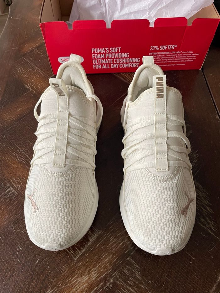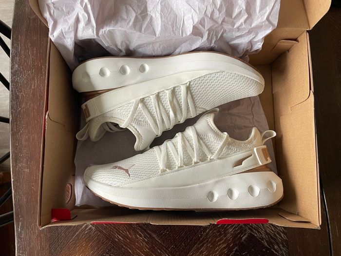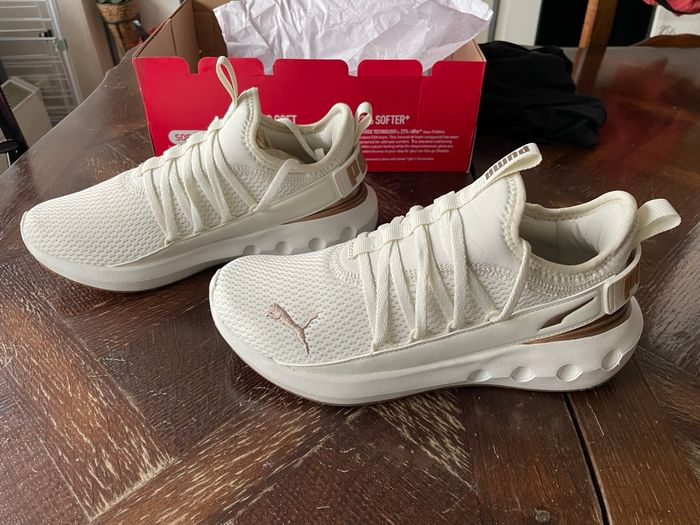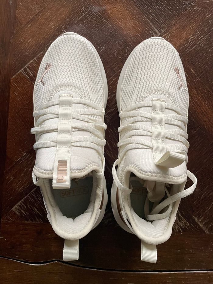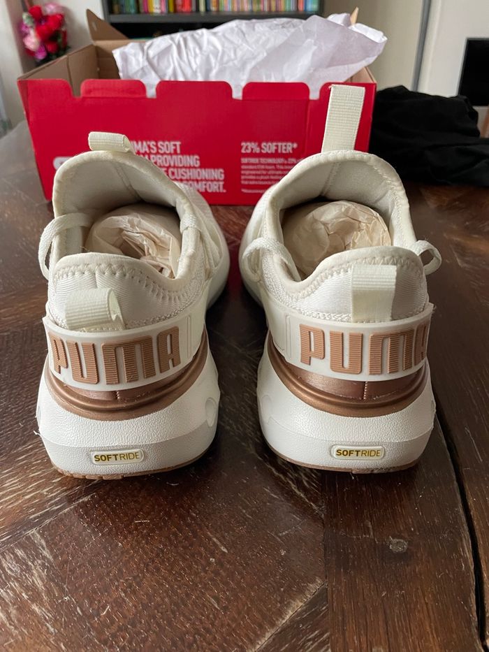 Chaussures PUMA blanches et dorées. Portées que 2 ou 3 fois et en très bon état. Vendues avec leur boite d’origine. Achetées 59,99€ à intersport.