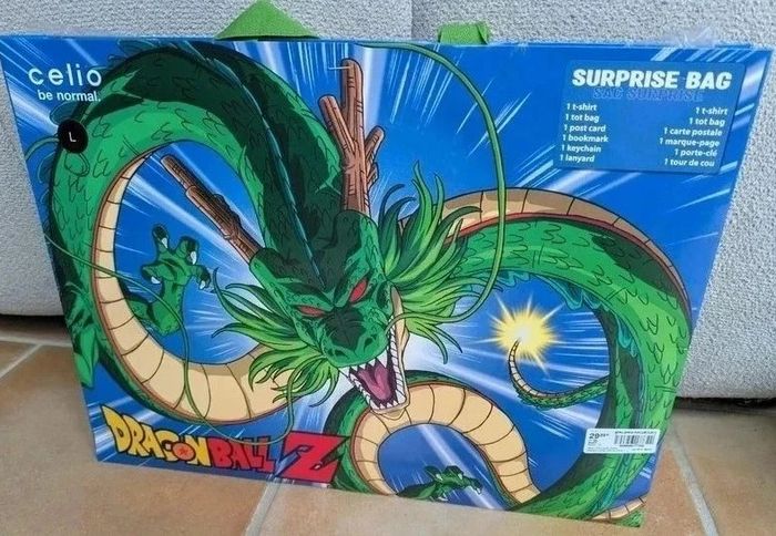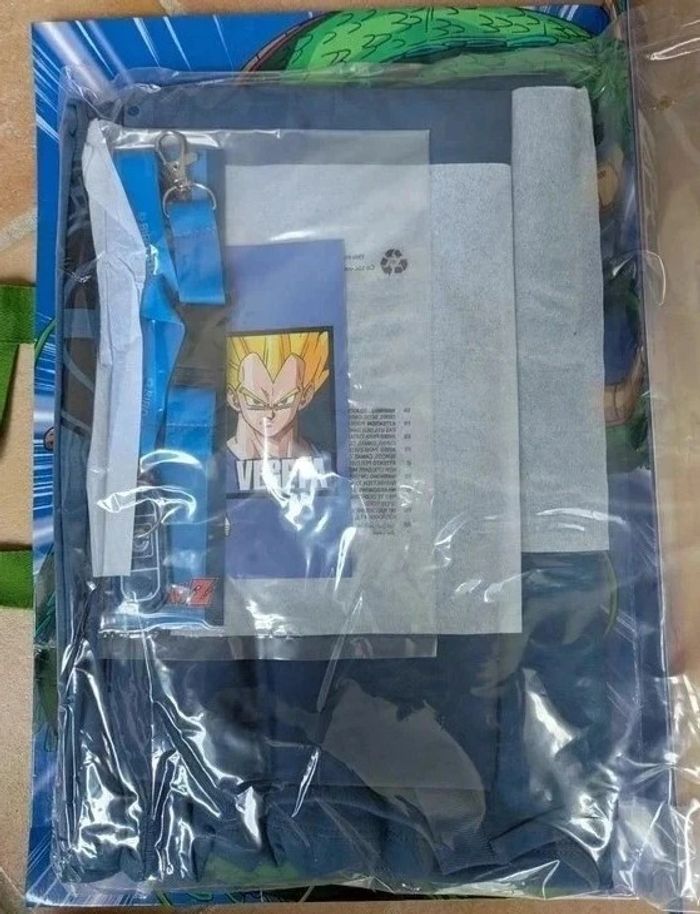 Lot 6 articles Sac surprise commercialisé uniquement a la Japan expo 2024 Dragon Ball Z contenant 1 t-shirt taille L 1 tot bag 1 carte postale 1 maque page 1 porte clé 1 tour de cou Le tout encore scellé