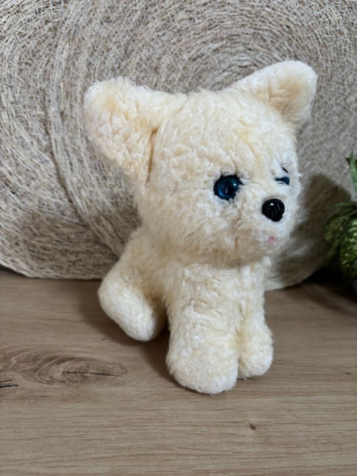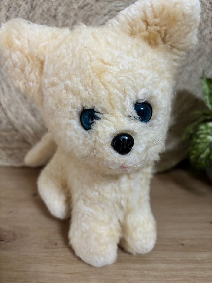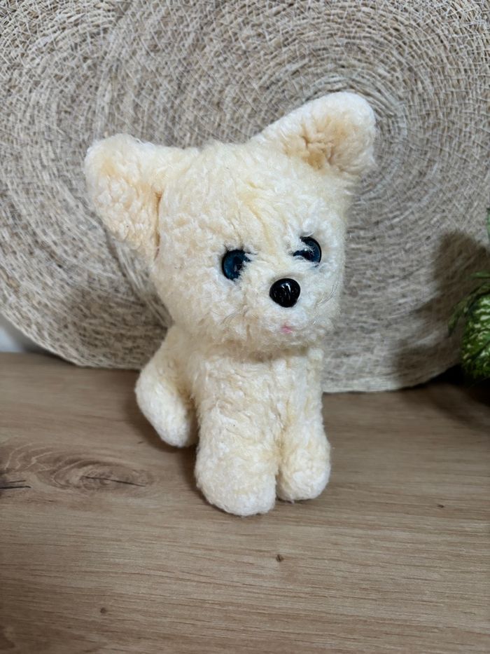 Vintage ancienne peluche chien beige écru yeux bleus assis - photo numéro 1