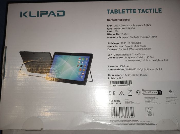 Klipad KL638DK est un tablette une taille d’écran de 10.1" et une résolution d’écran de 1280 X 800 Pixels.
