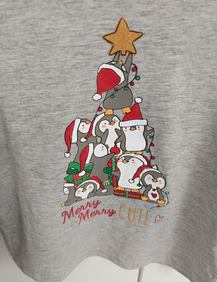 Motif trop mignon : des petits pingouins formant un sapin de Noël, avec détails colorés et inscription Merry Merry Cute ✨