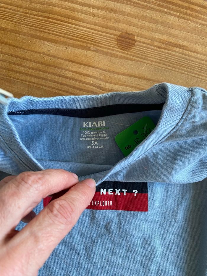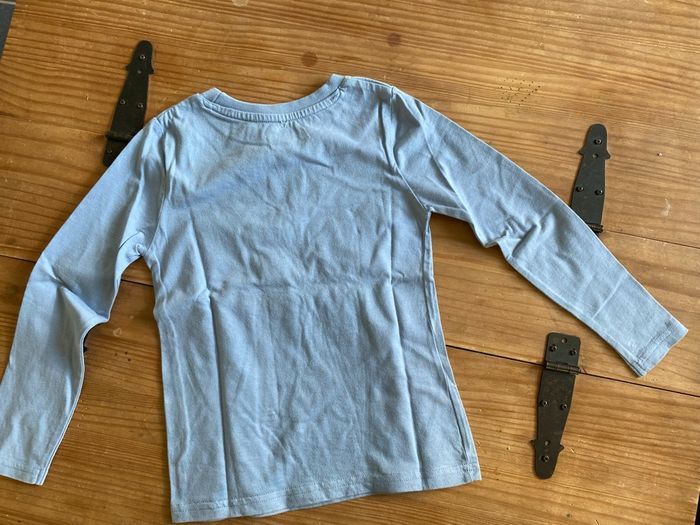 Je vends ce t-shirt bleu ciel de la marque Kiabi pour enfant de 5 ans. État proche du neuf, peu porte. 100% coton.