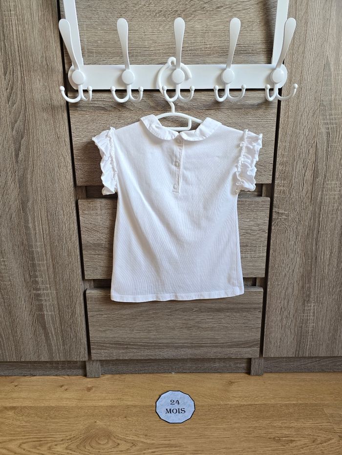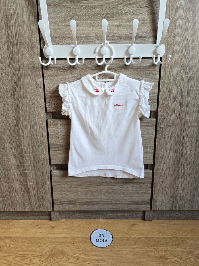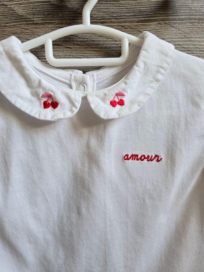 - Un t-shirt fantaisie, avec son inscription "Amour" brodée et ses broderies de coeurs et cerises sur le col. Volants sur les manches