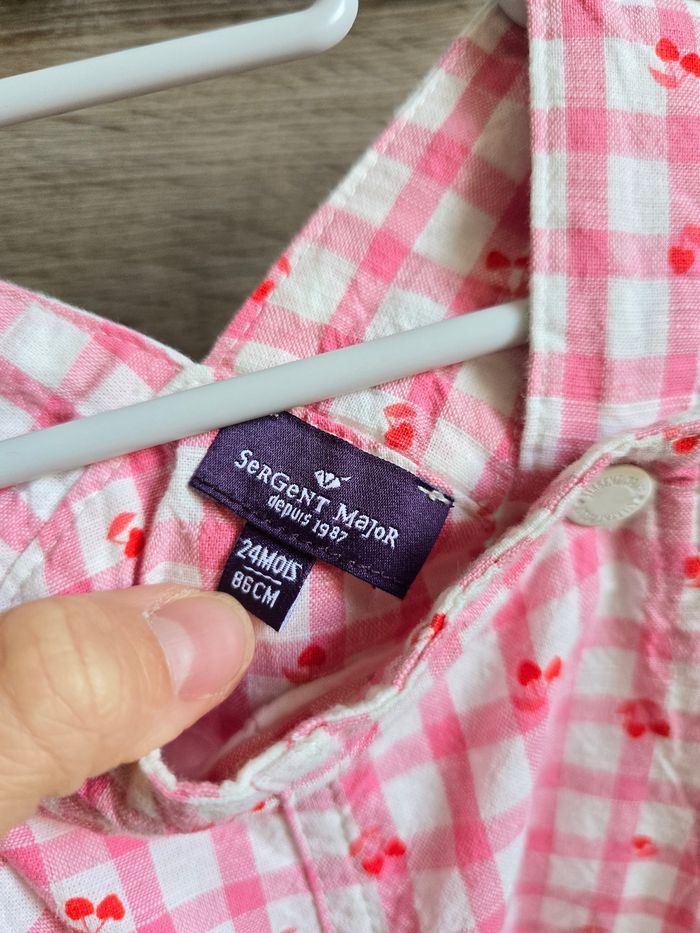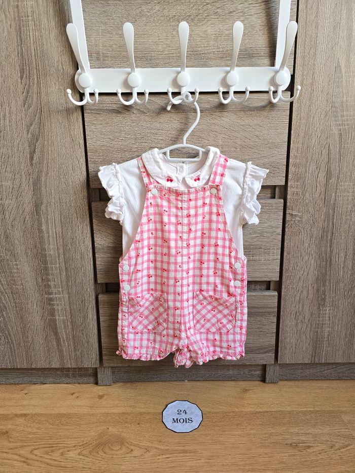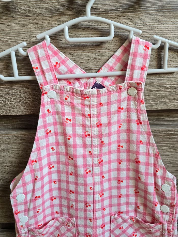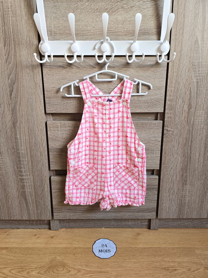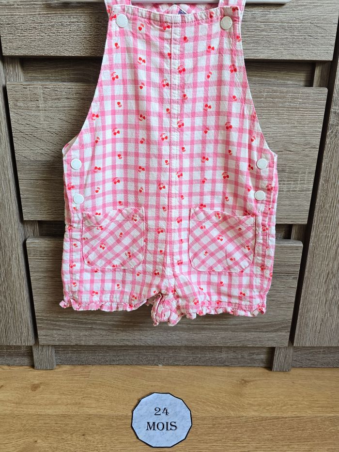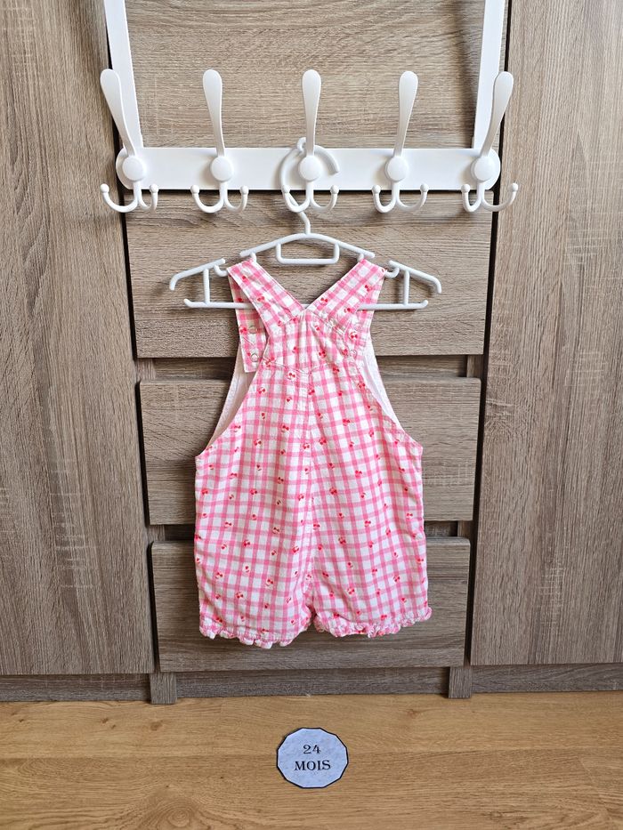 - Une salopette courte en vichy rose, avec ses imprimés coeurs et cerises rouges. Volants sur les cuisses.