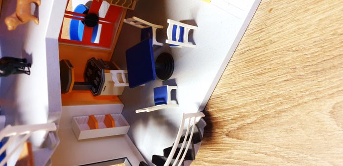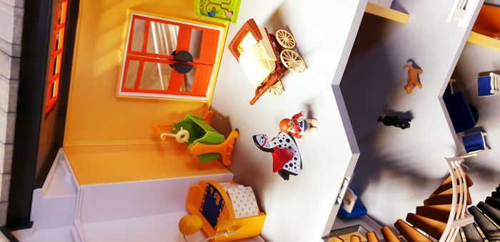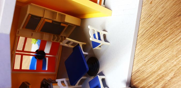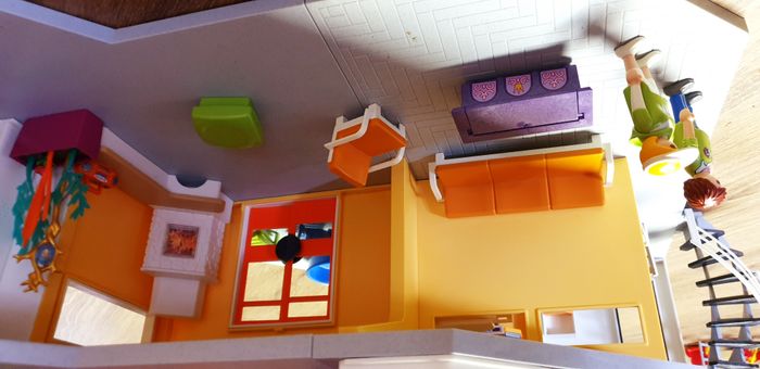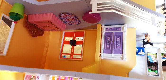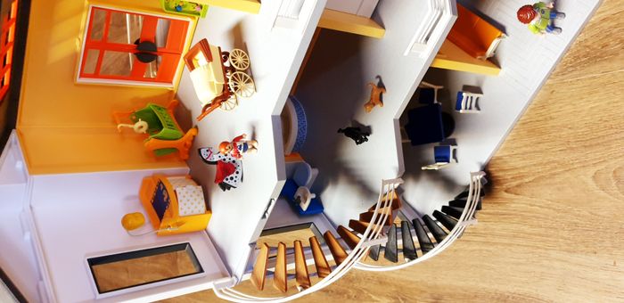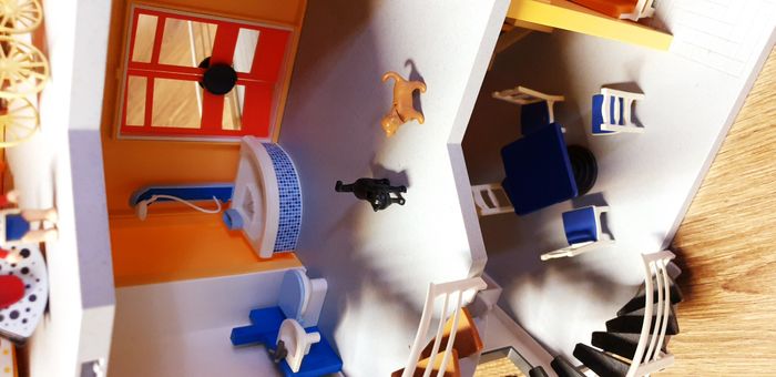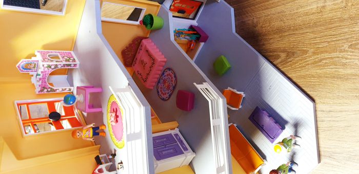 Immeuble Playmobil avec personnages, meubles et accessoires. Nombreuses photos pour se rendre compte du contenu exact. La sonnette fonctionne.