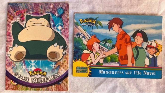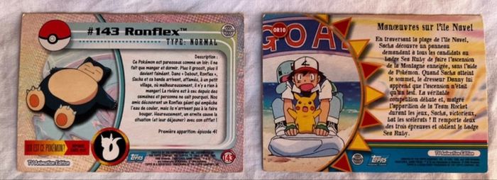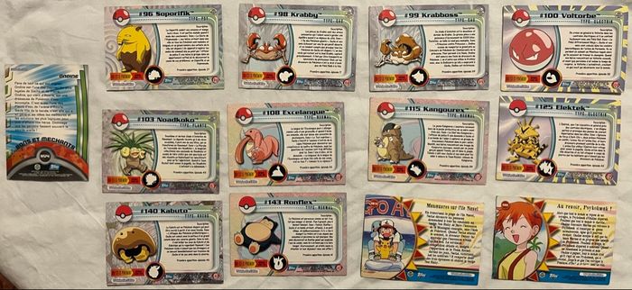 🔹 13 cartes Topps Pokémon : * Soporifik (#096) * Krabby (#098) * Krabboss (#099) * Voltorbe (#100) * Noadkoko (#103) * Excelangue (#108) * Kangourex (#115) * Élektek (#125) * Kabuto (#140) * Ronflex (#143) * Ondine en action * Au revoir Psykokwak ! * Manœuvres sur l’île Navel 📸 État général : * 🟡 11 cartes en bon état : coins légèrement blanchis ou usure minime. * 🔸 2 cartes en état correct : Ronflex et Manœuvres sur l’île Navel présentent une usure plus marquée (voir photos recto/verso). 💡 Idéal pour un collectionneur nostalgique, une déco rétro ou un fan de l’anime Pokémon !