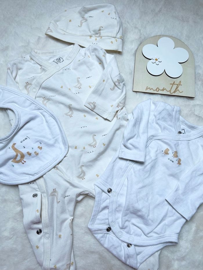 Ensemble pyjama, body, bonnet et bavoir avec les petites oies . Taille naissance mais taille assez grand je dirais plutôt 56cm Matière légère Porté 1x