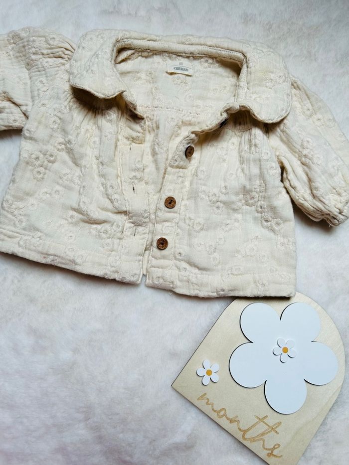Gilet avec petite fleure beige il a été porté 3x Super facile à enfiler grâce à ses manches bouffantes. Taille 50cm, mais taille grand